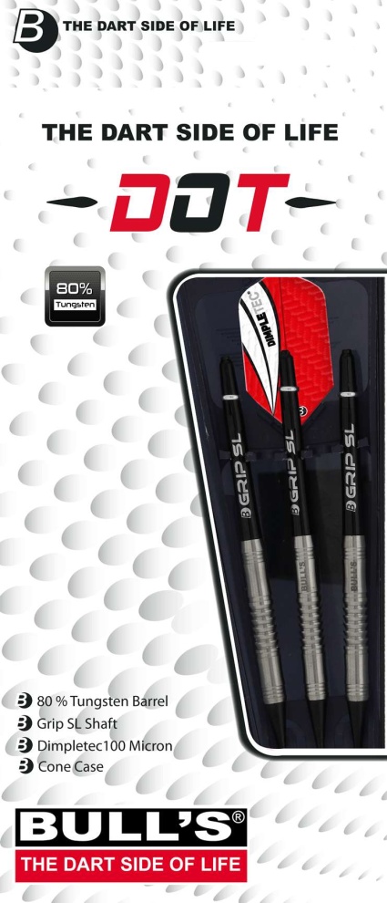 Rzutki Bull's Dot z miękkiego wolframu to doskonałej jakości rzutki turniejowe. Beczki mają dwa rodzaje rowków, Shark-Grip pośrodku. Logo Bull's jest wygrawerowane na końcu. Lufy są wyposażone w uchwyty B-Grip SL i łaty Dimpletec. Zapakowane w plastikową walizkę.