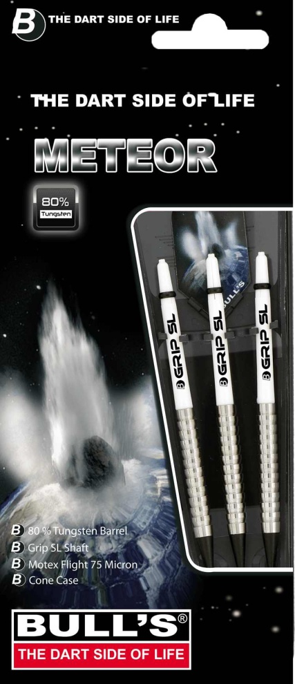 Miękkie rzutki Bull's Meteor to idealne wprowadzenie do świata rzutek wolframowych. Beczki są wykonane z wysokiej jakości 80% wolframu. Mają rowki Shark-Grip na całej długości, dzięki czemu mają doskonałą przyczepność i nie ślizgają się. Uzupełniają je uchwyty B-Grip SL i łaty Motex. Zapakowane w plastikowe etui.