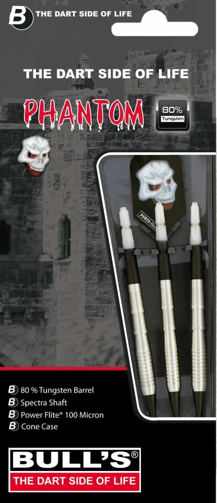 Miękkie rzutki Bull's Phantom to wysokiej jakości wolframowe rzutki o eleganckim wyglądzie. Lufy są wąskie, z ząbkami Shark-Grip z przodu i drobnymi paskami z tyłu. Rzutki dobrze leżą w dłoni. Lufy są uzupełnione uchwytami Spectra i uchwytami Power.
