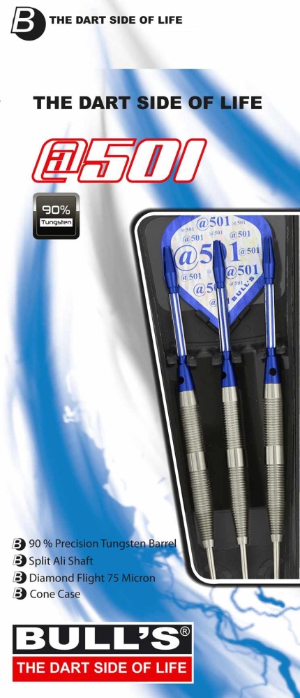 Stalowe rzutki Bull's @501 to precyzyjnie wykonane rzutki z wysokiej jakości 90% wolframu. Beczki są mikro-rowkowane, dzięki czemu idealnie pasują do dłoni. W komplecie znajdują się niebieskie aluminiowe uchwyty Split Alu i pałki Fantasy. Zapakowane są w plastikowe etui.