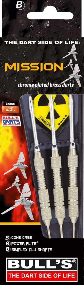 Stalowe rzutki Bull's Mission to mosiężne rzutki z chromowanym wykończeniem. Beczki są chropowate, dobrze się trzymają i nie ślizgają się. Uzupełnieniem są aluminiowe uchwyty Simplex i pałki Power Flite. Pakowane w plastikowe etui.