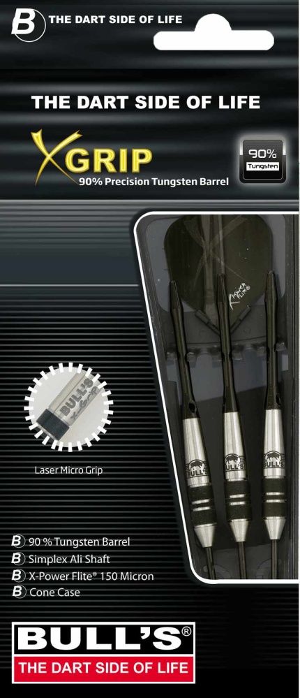 Stalowe lotki wolframowe Bull's X-Grip są produkowane przy użyciu najnowszej technologii Laser-Micro. Beczki charakteryzują się doskonałą stabilnością i wyważeniem. Beczki są ozdobione logo Bull's X-Grip i uzupełnione aluminiowymi uchwytami Simplex oraz lotkami X-Power Flite. Zapakowane w plastikową walizkę.