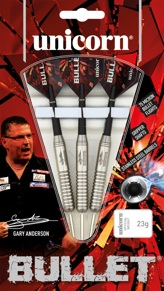 Stalowe rzutki Unicorn Bullet Gary Anderson to rzutki z mosiężnymi lufami, na których widnieje napis Unicorn i podpis Gary'ego Andersona. Lufy są precyzyjnie radełkowane i dobrze się trzymają. Lufy są wyposażone w uchwyty Gripper i pałki Unicorn Bullet.