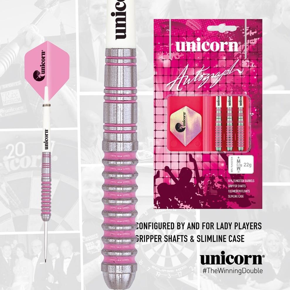 Unicorn Autograph Steel Darts to rzutki wolframowe (80% wolframu), które zostaną szczególnie docenione przez panie. Beczki są ozdobione różowymi paskami i są uzupełnione uchwytami Gripper i łatami Unicorn. W zestawie znajduje się smukłe etui.