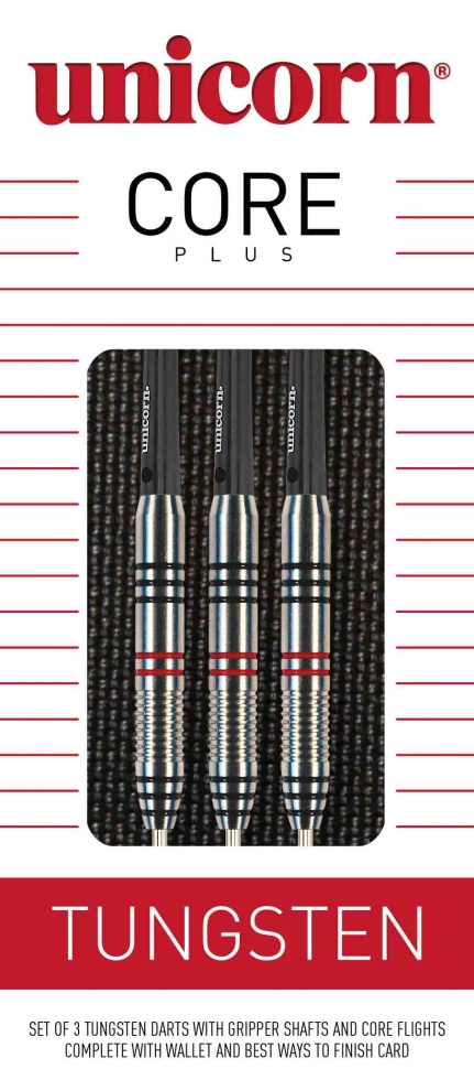 Stalowe lotki Unicorn Core Plus Tungsten to wysokiej jakości lotki wolframowe (80% wolframu). Beczki są wąskie, radełkowane i ozdobione czerwonymi i czarnymi paskami. Beczki są ozdobione napisem Unicorn Tungsten i są w komplecie z uchwytami Gripper i pałkami Unicorn.