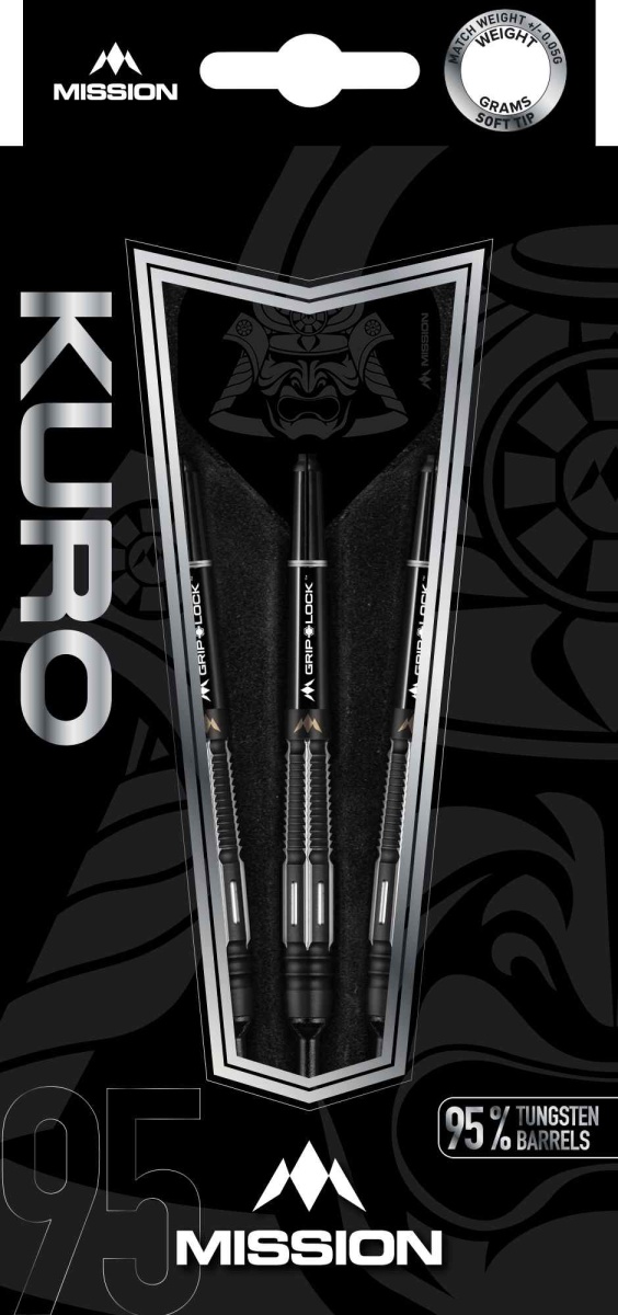 Mission Kuro to rzutki wolframowe (95% wolframu) o nowoczesnym czarno-srebrnym designie. Lufy mają zwężającą się końcówkę, a także stopniowo zwężają się z tyłu lufy, gdzie znajduje się charakterystyczny rowek (Shark Grip), który sprawia, że rzutka świetnie się trzyma i nie ślizga się. Czarna powłoka z azotku tytanu nadaje rzutkom wyjątkowy wygląd. Tylna część beczki jest ozdobiona logo Mission. Lufy są uzupełnione nylonowymi uchwytami i pałkami Mission.