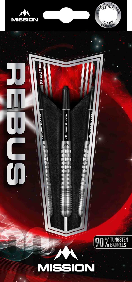 Rzutki stalowe Mission Rebus to rzutki wolframowe (90% wolframu) o sportowym wyglądzie. Beczki są proste i rowkowane w pierwszej połowie. W drugiej połowie stopniowo się zwężają. W środkowej części promieniste rowki są ozdobione frezowanymi pierścieniami. Tylna część lufy łączy promieniowe i równoległe frezowane rowki. Lufa jest ozdobiona logo Mission. Lufy są zakończone nylonowymi uchwytami i listwami Mission.