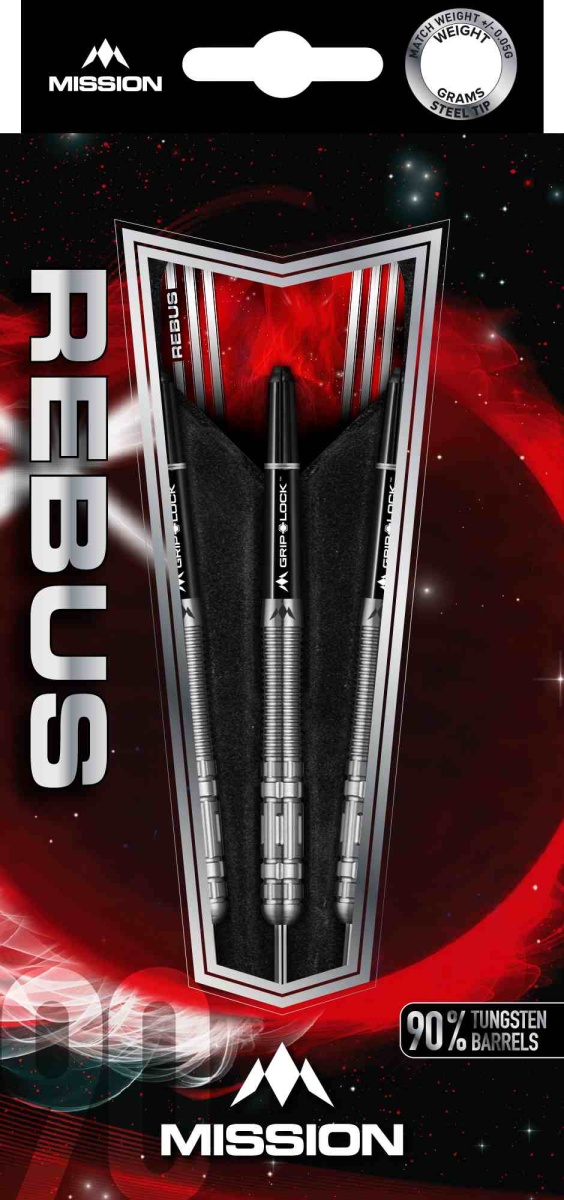 Rzutki stalowe Mission Rebus to rzutki wolframowe (90% wolframu) o sportowym wyglądzie. Beczki są kombinacją różnych rodzajów rowków. Koniec beczki jest ozdobiony logo Mission. Lufy są uzupełnione nylonowymi uchwytami i pałkami Mission.