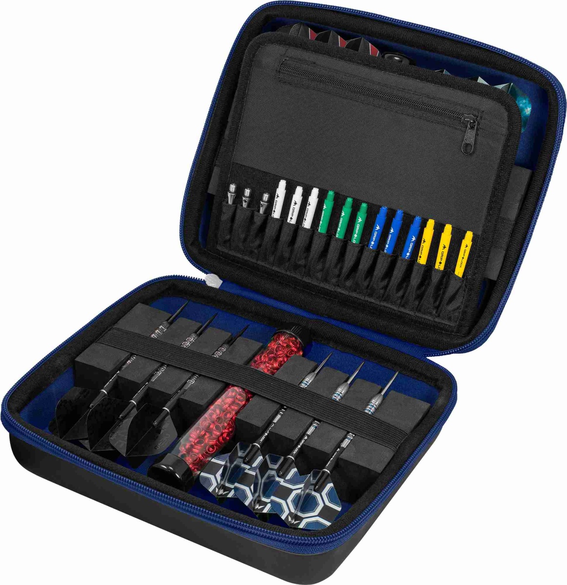Etui na rzutki Mission Freedom Luxor to luksusowe etui wykonane z wytrzymałego materiału EVA, które pozwala bezpiecznie przechowywać do czterech zestawów zmontowanych rzutek. Etui ma również kilka kieszeni na akcesoria i zawiera dwa plastikowe woreczki na końcówki. Etui jest solidne, miękkie w dotyku i ozdobione logo Mission, co nadaje mu wyjątkowy wygląd. Kabura posiada pasek ułatwiający przenoszenie.
