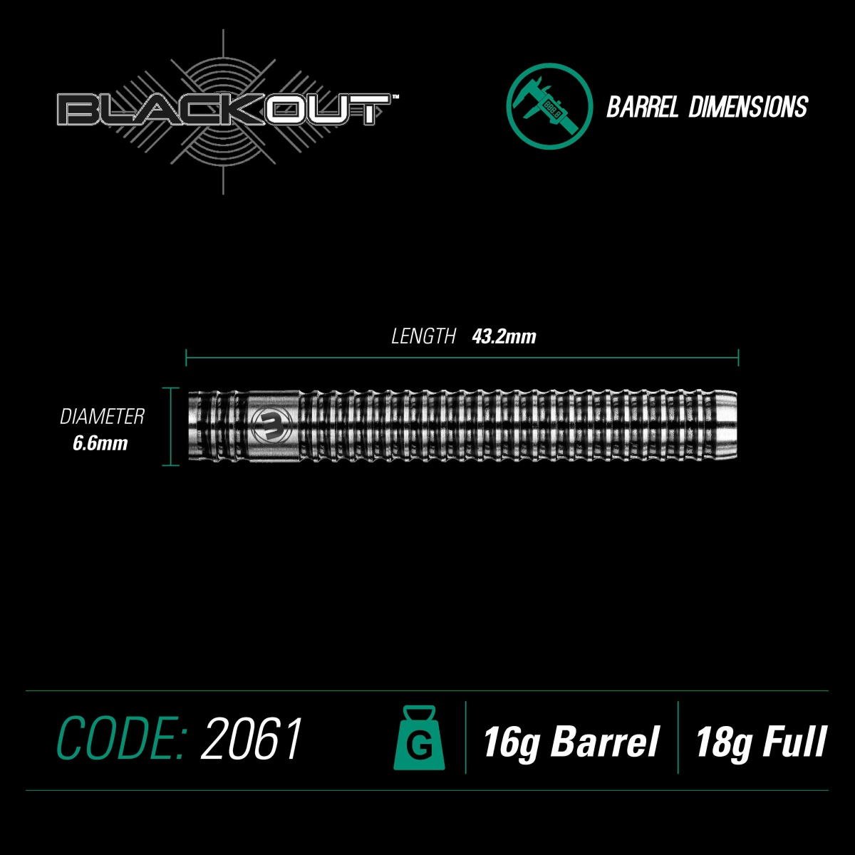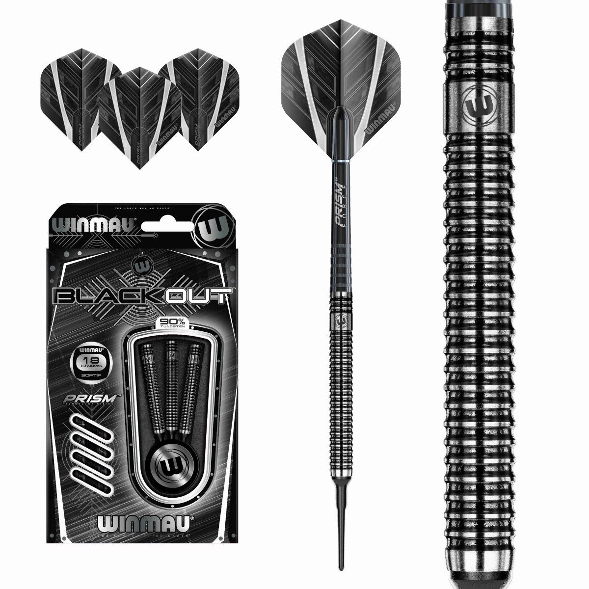 Miękkie lotki Winmau Blackout to lotki wolframowe (90% wolframu), których lufy są ozdobione czarnymi paskami i logo Winmau. Beczki są uzupełnione uchwytami Prism Force i eskadrami Prism Alpha.