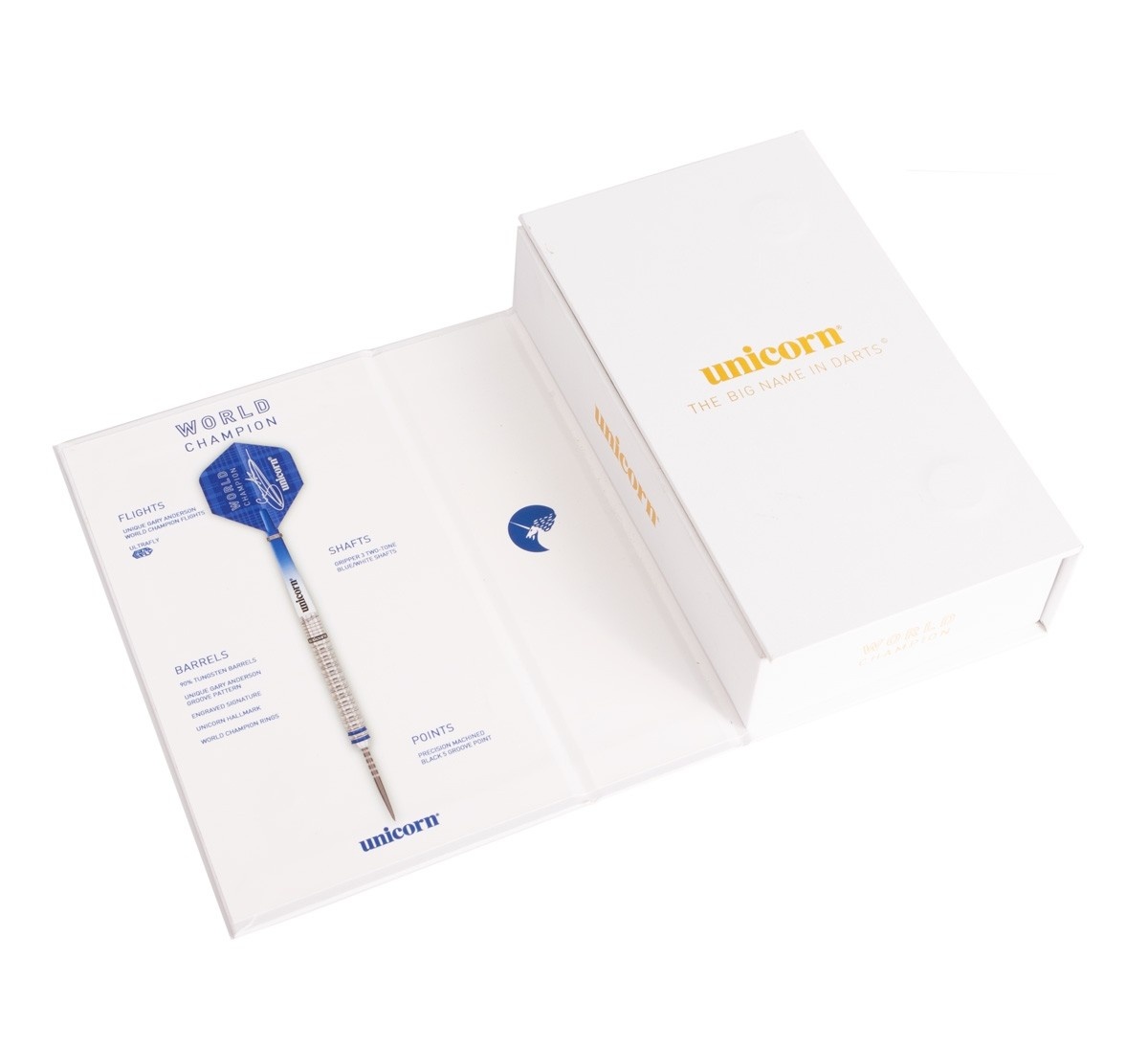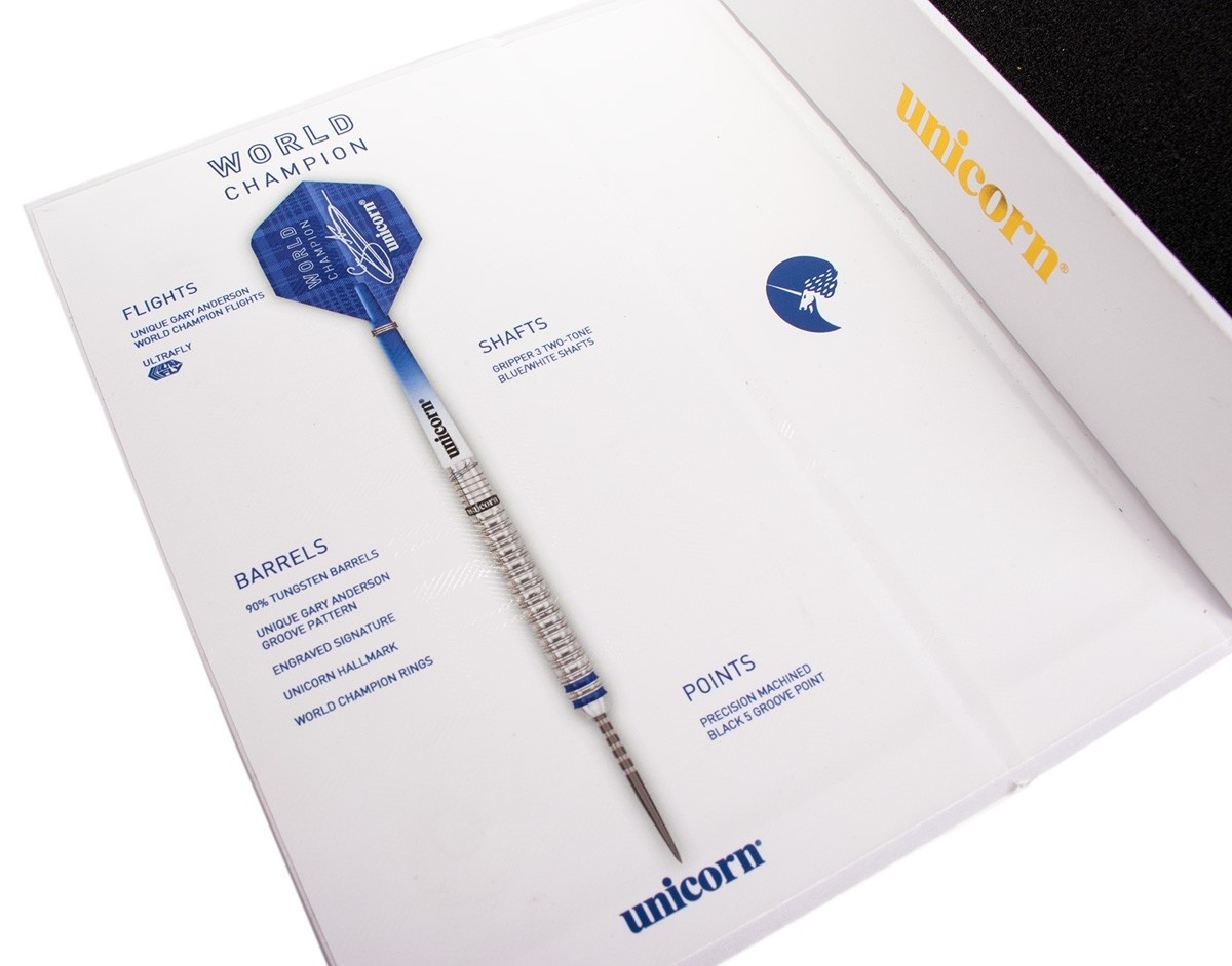 Unicorn World Champion 2019 Edition Steel Darts to rzutki wolframowe (90% wolframu) z beczkami ozdobionymi napisem Unicorn i podpisem Gary'ego Andersona. Beczki są karbowane na całej długości, a na początku wyróżniają się dwa niebieskie paski. Lufy są wyposażone w nylonowe uchwyty i pałki Unicorn World Champion.