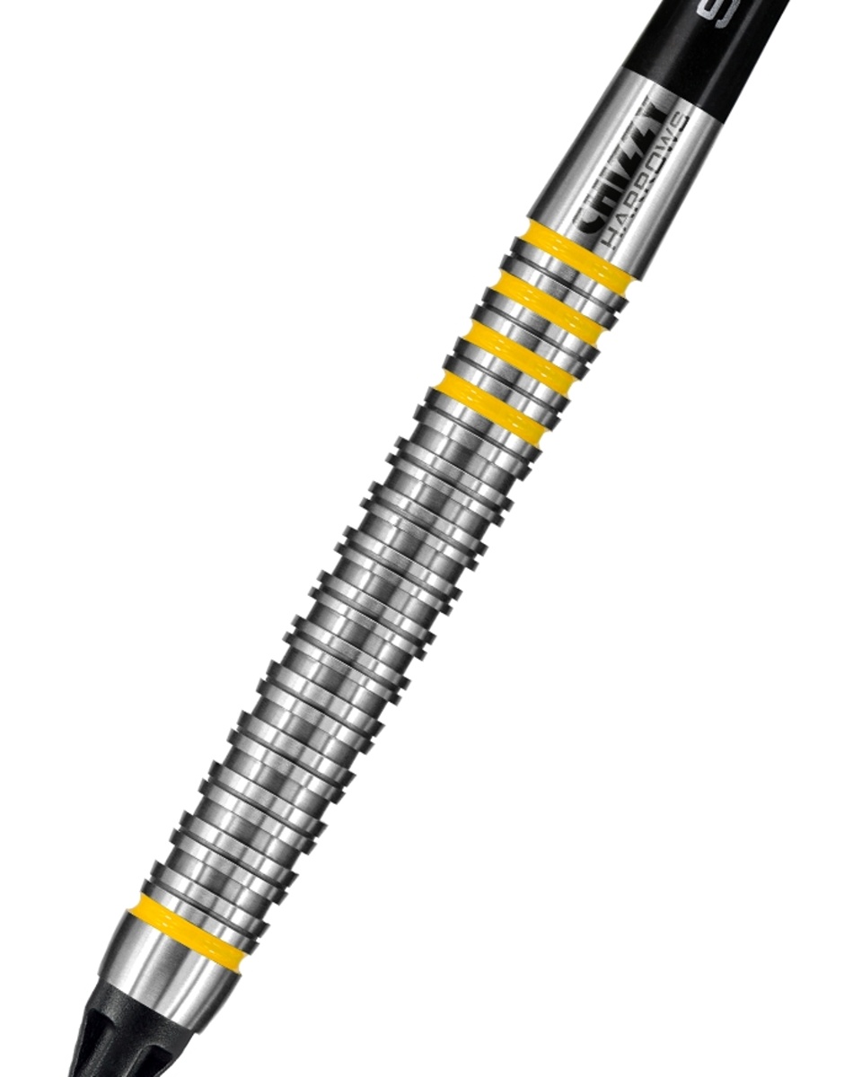 Miękkie lotki Chizzy to lotki wolframowe (80% wolframu) z lufami, które są zapiekanymi wzdłuż ich długości i ozdobione żółtymi paskami i napisem Chizzy Harrows. Beczki są zakończone uchwytami Supergrip i łatami Chizzy.