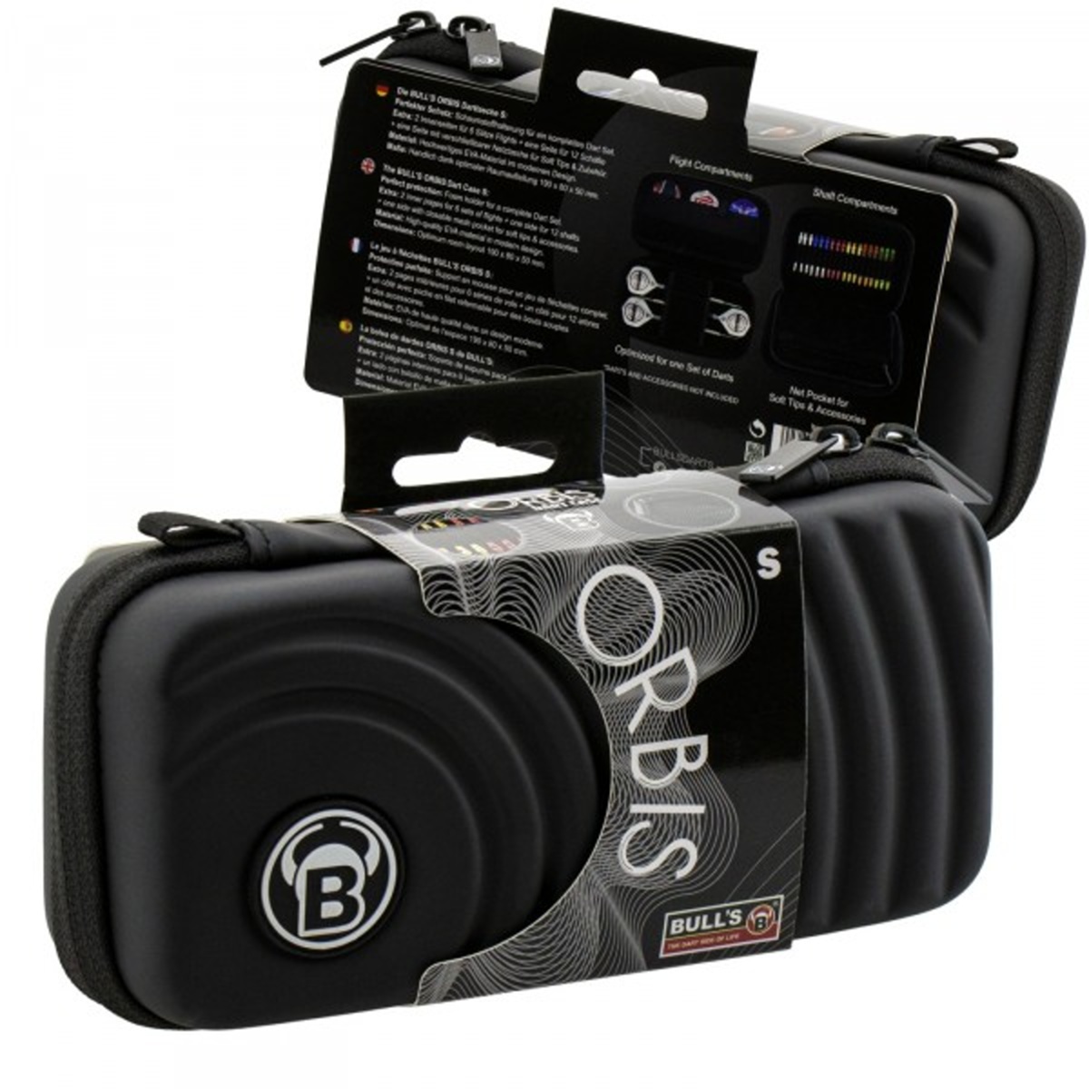 Etui na rzutki Bull's Orbis to najnowsza generacja twardych etui Bull's. Dzięki piankowemu wzmocnieniu, etui to zapewnia idealne trzymanie i ochronę dla kompletnego zestawu rzutek. Ponadto etui posiada kieszenie na akcesoria, które oferują miejsce na 6 zestawów kijów i 12 uchwytów. W zestawie znajduje się poręczna, zapinana na zamek kieszeń na miękkie końcówki i akcesoria. Kabura Orbis została wykonana z wysokiej jakości wytrzymałego materiału EVA i charakteryzuje się nowoczesnym designem z logo Bull's. Eskadry mogą pozostać na lotkach bez uszkodzenia. Etui posiada zamek błyskawiczny i łatwo się otwiera. Etui zawiera również pasek na rękę.