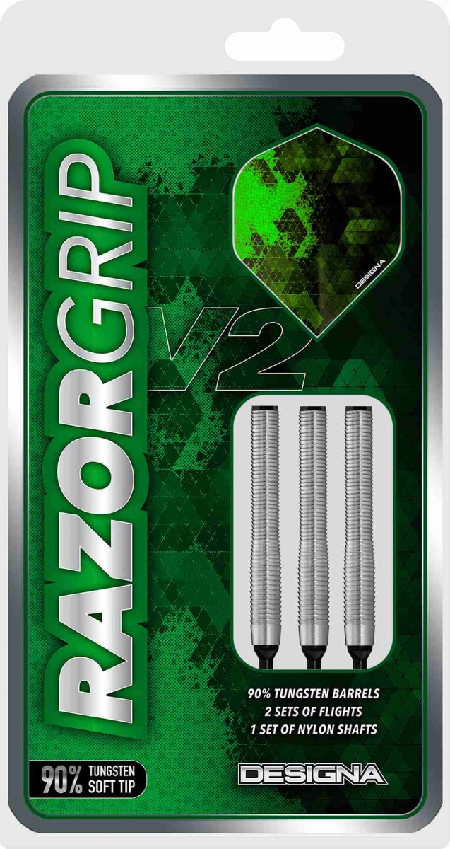 Designa Razor Grip Soft Darts to wysokiej jakości rzutki wolframowe (90% wolframu) z radełkowanymi lufami na całej długości. Uzupełniają je nylonowe uchwyty i pałki Designa.