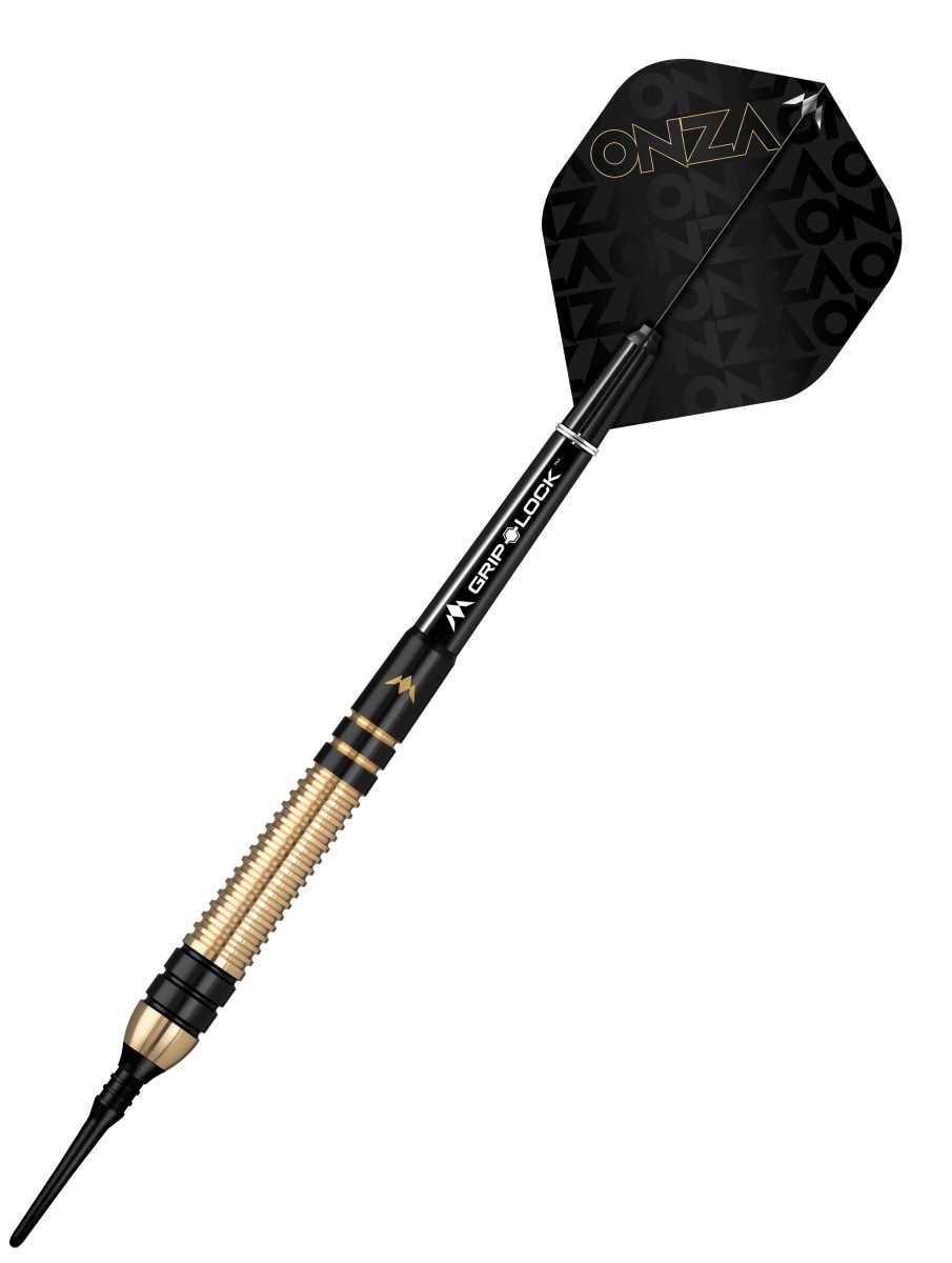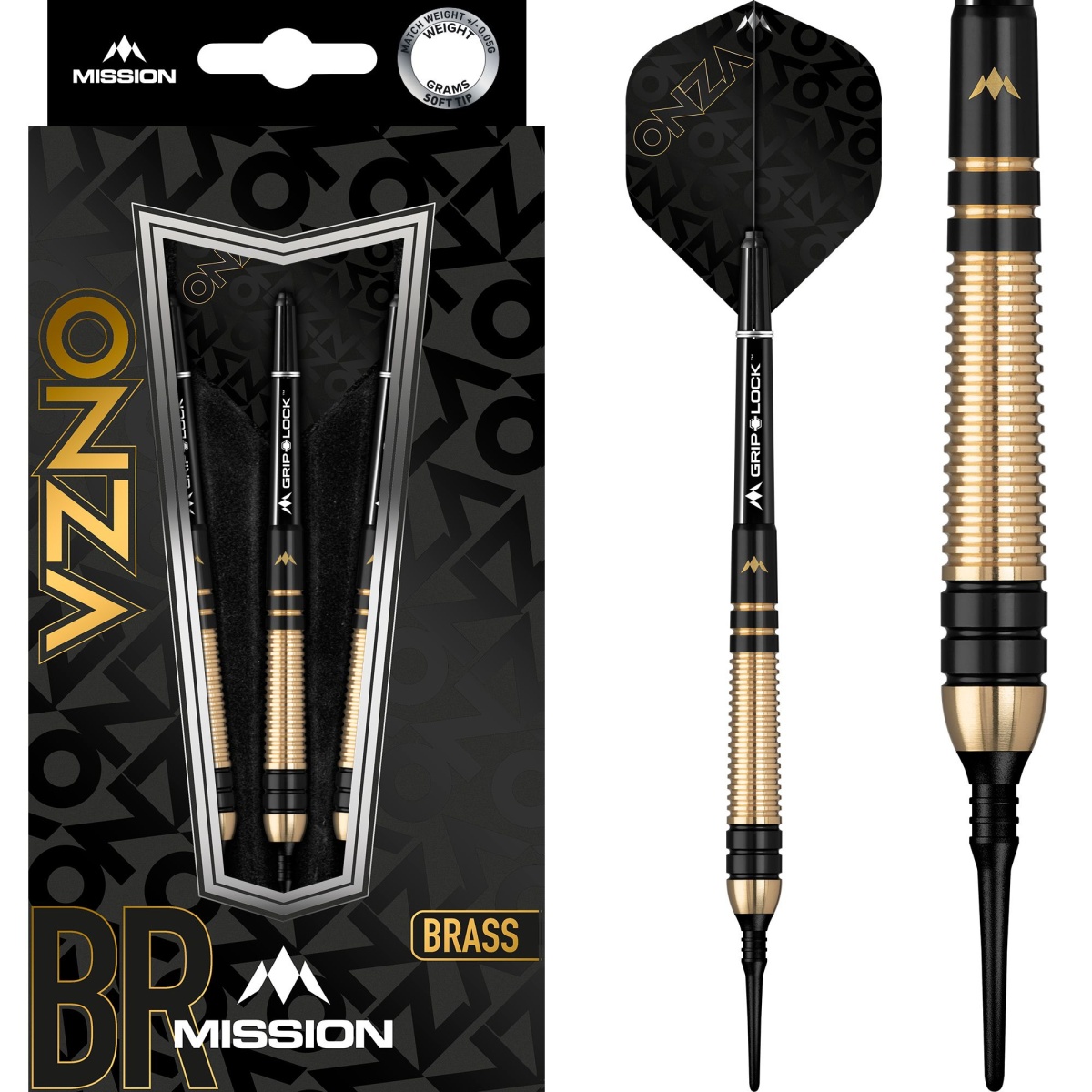 Mission Onza soft to mosiężne rzutki z czarnymi i złotymi lufami. Lufy są uzupełnione nylonowymi uchwytami Grip Lock i pałkami Mission Onza.