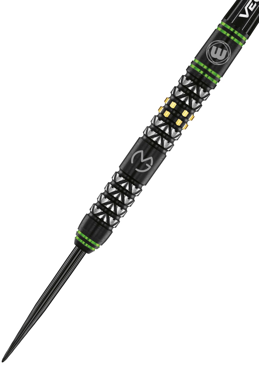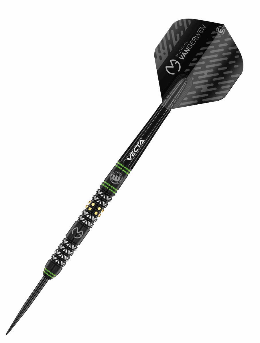 Stalowe lotki Winmau Michael van Gerwen - Vantage to lotki wolframowe (90% wolframu) o doskonałym designie. Czarne beczki z unikalnymi rowkami są ozdobione zielonymi paskami, logo MvG i Winmau.