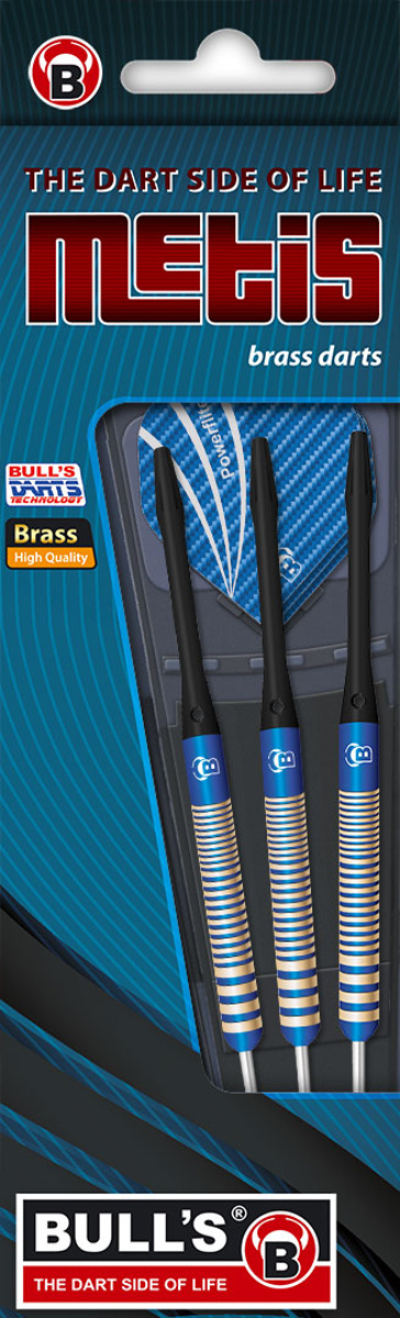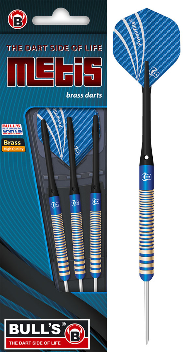 Stalowe rzutki Bull's Metis to mosiężne rzutki z lufami z niebieskimi paskami. Rzutki są szczególnie odpowiednie dla początkujących.