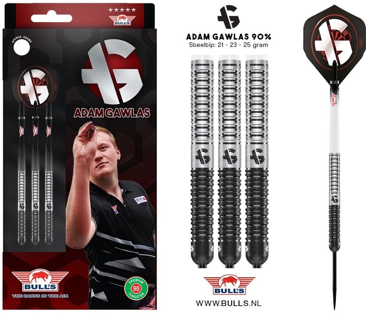 Adam Gawlas steel darts to lotki wolframowe (90% wolframu) od wicemistrza świata juniorów. Adam Gawlas jest czeskim podwójnym wicemistrzem świata juniorów i obecnie jest największym talentem w Czechach. Lufy są w kolorze czarnym i srebrnym. Uzupełniają je nylonowe uchwyty i pałki Adama Gawlasa.