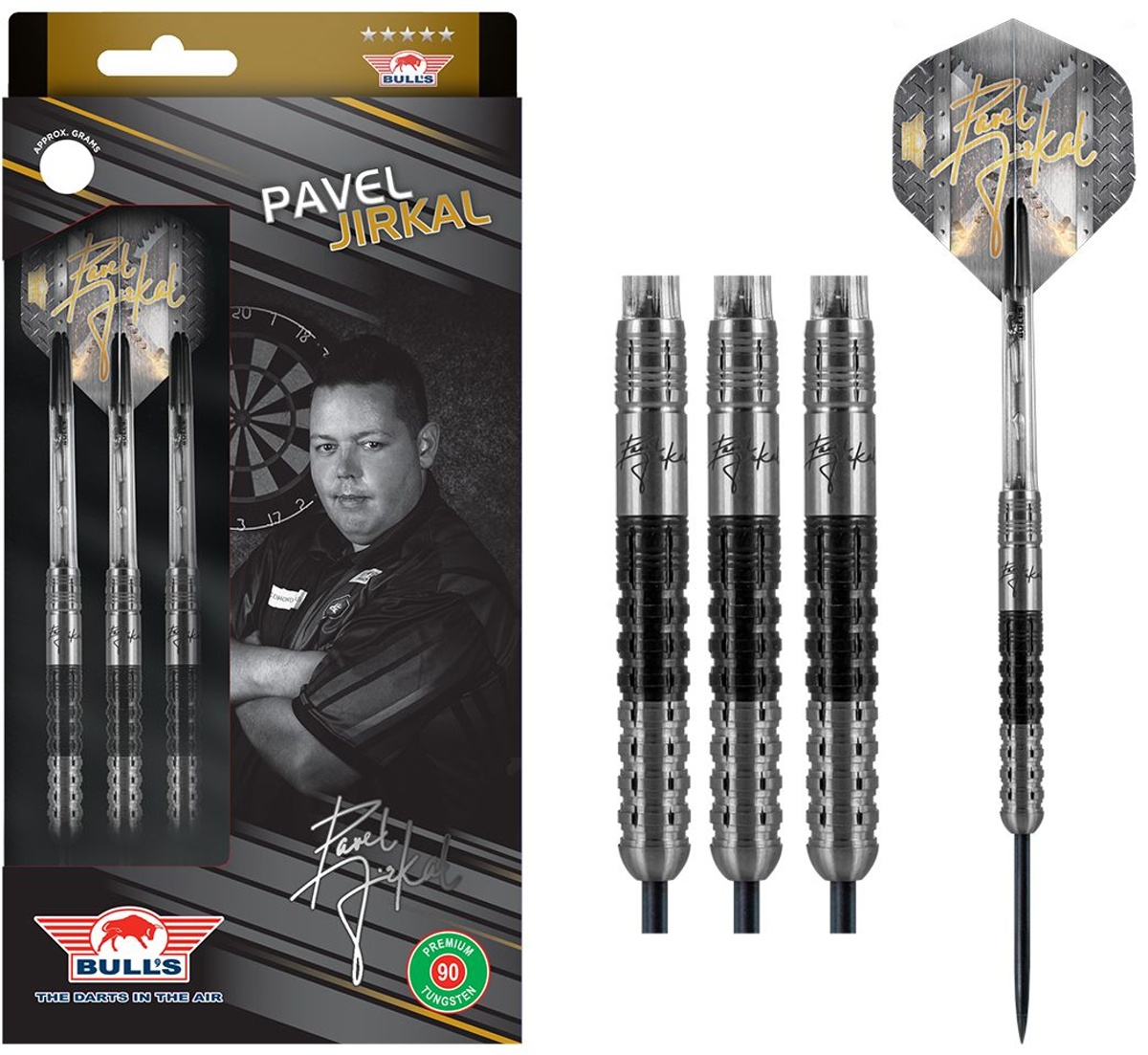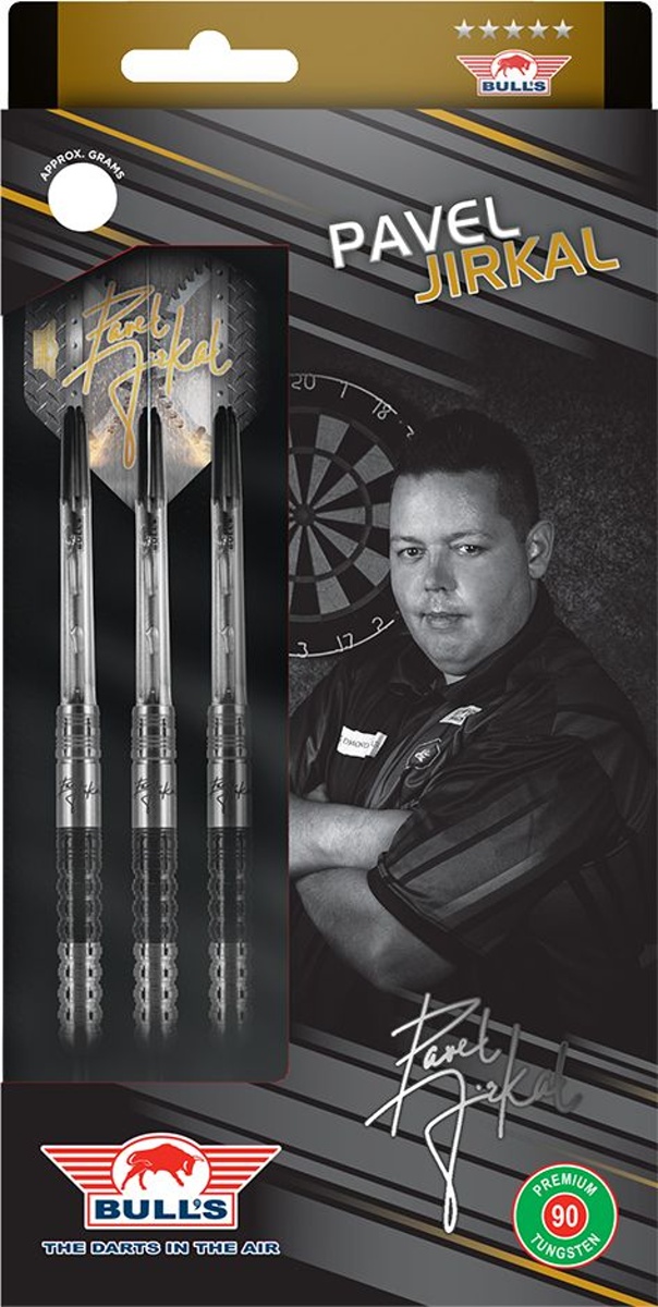 Stalowe lotki Pavel Jirkal to lotki wolframowe (90% wolframu) z lufami w kolorze czarno-srebrnym, które są ozdobione wygrawerowanym podpisem gracza. Uzupełniają je nylonowe uchwyty i pałki Pavel Jirkal.