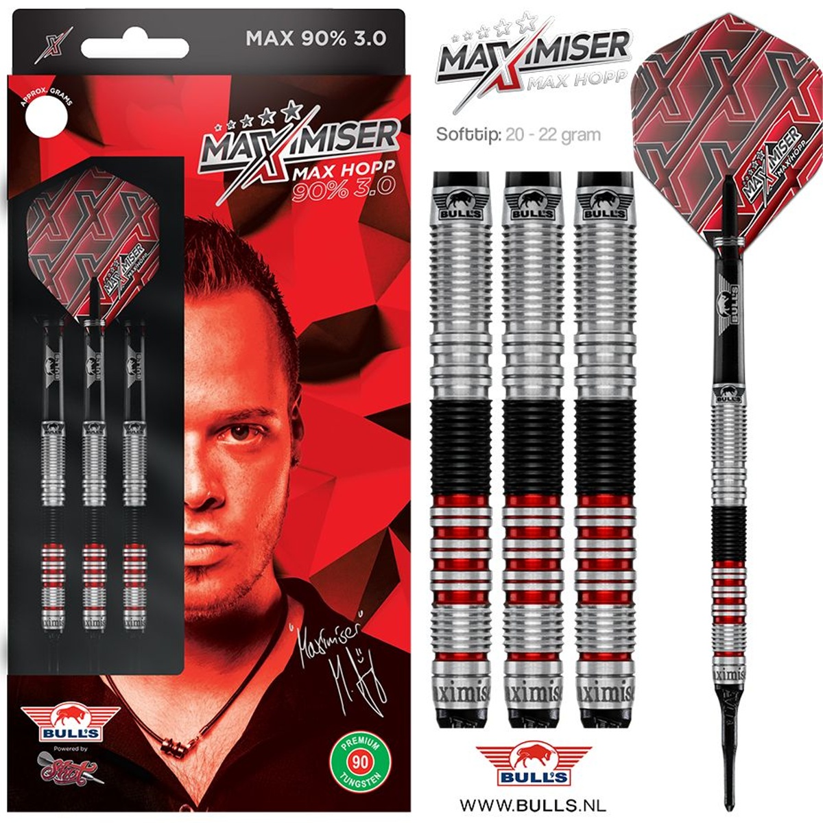 Miękkie lotki Max Hopp to wysokiej jakości lotki wolframowe (90% wolframu) z beczkami o nowoczesnym designie. Beczki mają dwa rodzaje rowków (Ringed, Wave), a czarno-czerwony kolor dodaje im charakteru. Są ozdobione logo Bull's, nylonowymi uchwytami i pałkami Max Hopp.