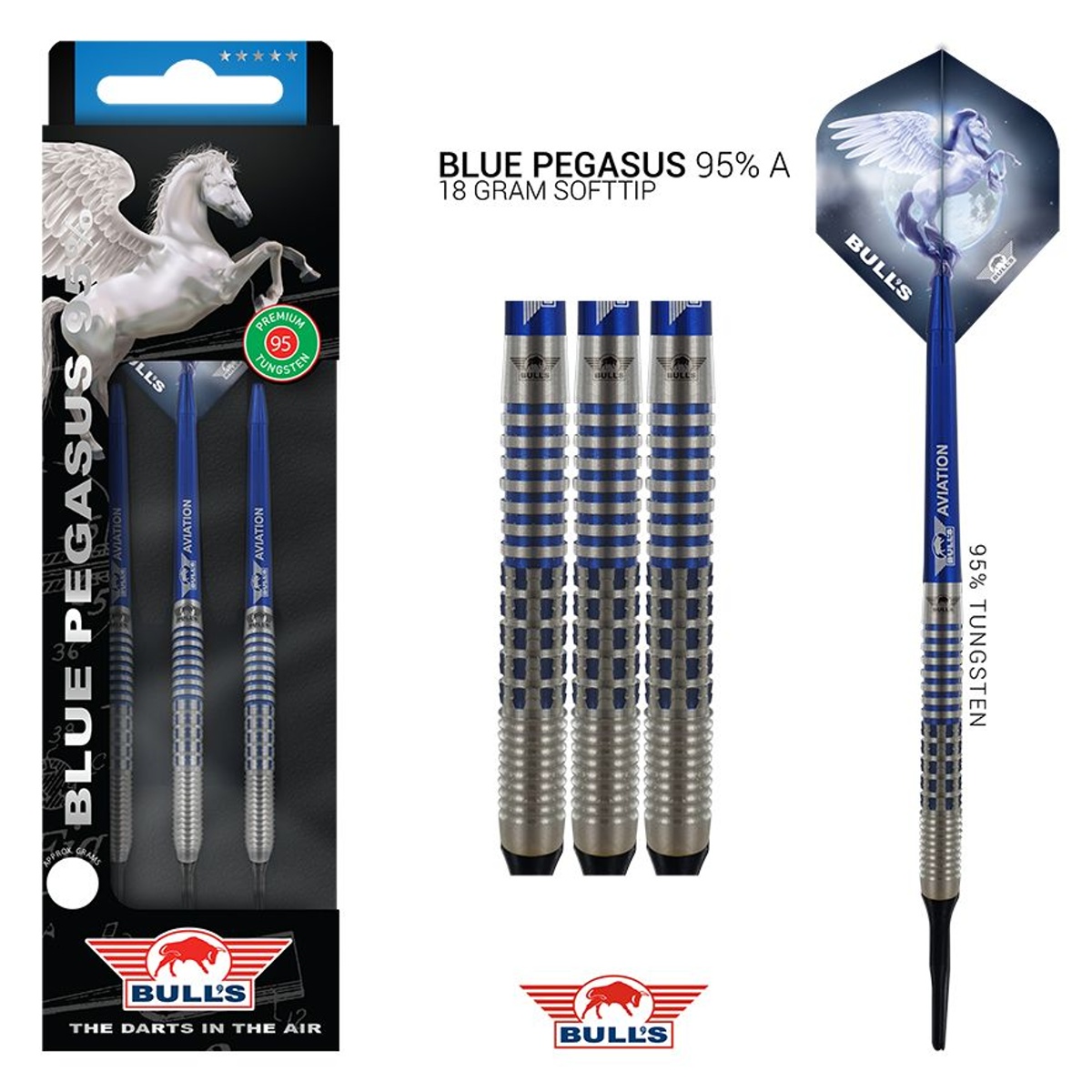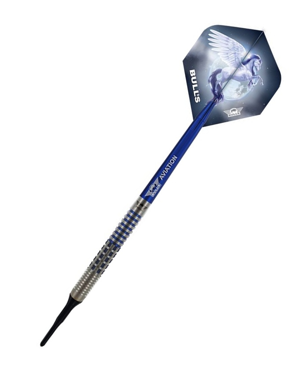 Miękkie lotki Blue Pegasus to wysokiej jakości lotki wolframowe (95% wolframu) z niebiesko-srebrnymi lufami. Lufy mają unikalne rowki i są ozdobione logo Bull's.