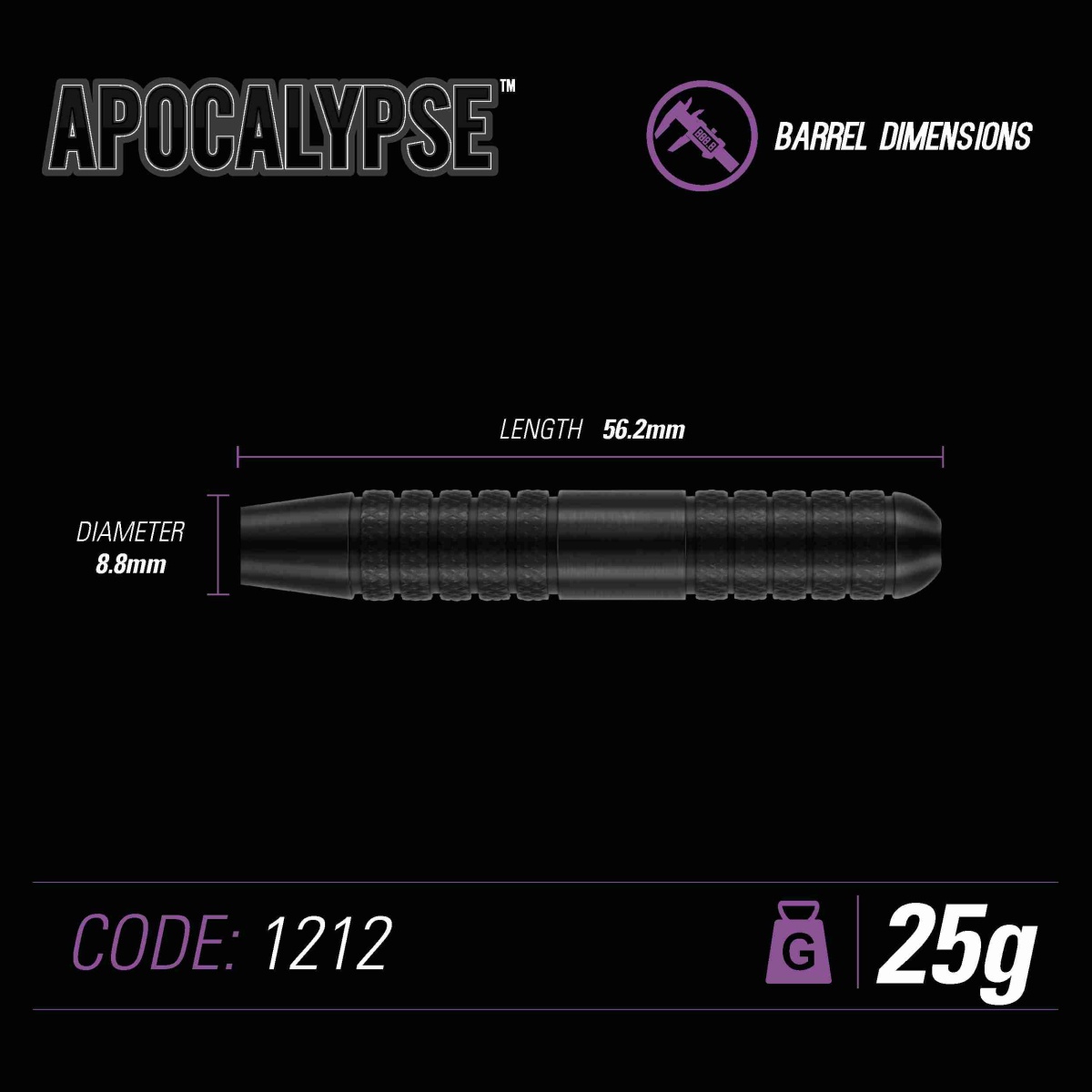 Stalowe rzutki Winmau Apocalypse to mosiężne rzutki o eleganckim wyglądzie. Czarne lufy są radełkowane z przodu i z tyłu. Lufy są uzupełnione uchwytami Prism i eskadrami Prism Alpha.