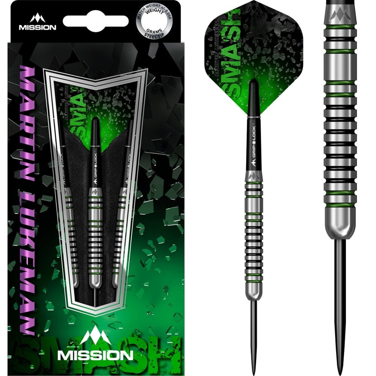 Stalowe rzutki Mission Martin Lukeman to wolframowe rzutki (90% wolframu) z lufami ozdobionymi zielonymi i czarnymi rowkami oraz logo Mission. Lufy są uzupełnione nylonowymi uchwytami Grip Lock i pałkami Mission.