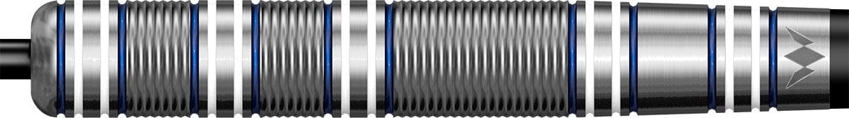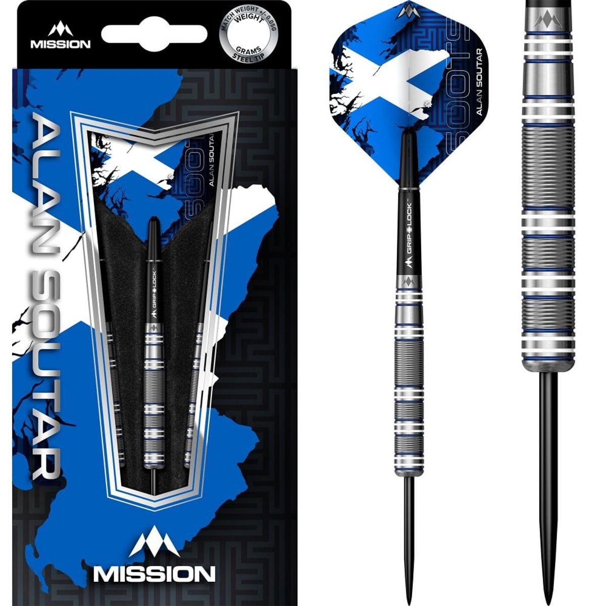 Rzutki stalowe Mission Alan Soutar to wolframowe rzutki (90% wolframu) z lufami, które łączą mikro rowki i promieniowe rowki podkreślone niebieskim i białym kolorem. Lufy są ozdobione logo Mission, nylonowymi uchwytami Grip Lock i pałkami Mission.