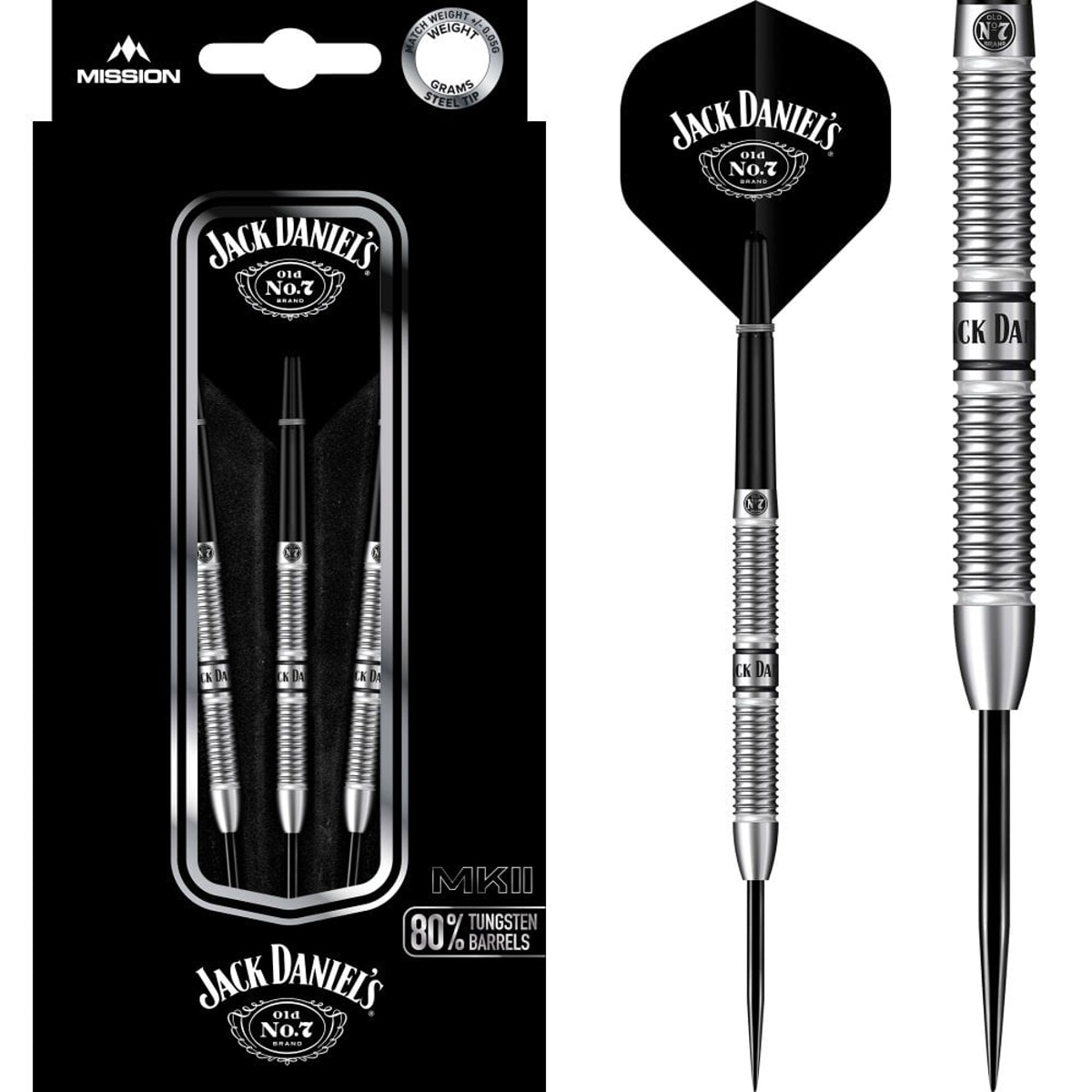 Stalowe lotki Mission Jack Daniels to lotki wolframowe (80% wolframu) z lufami ozdobionymi napisem Jack Daniels. Lufy są uzupełnione nylonowymi uchwytami i pałkami Jack Daniels.