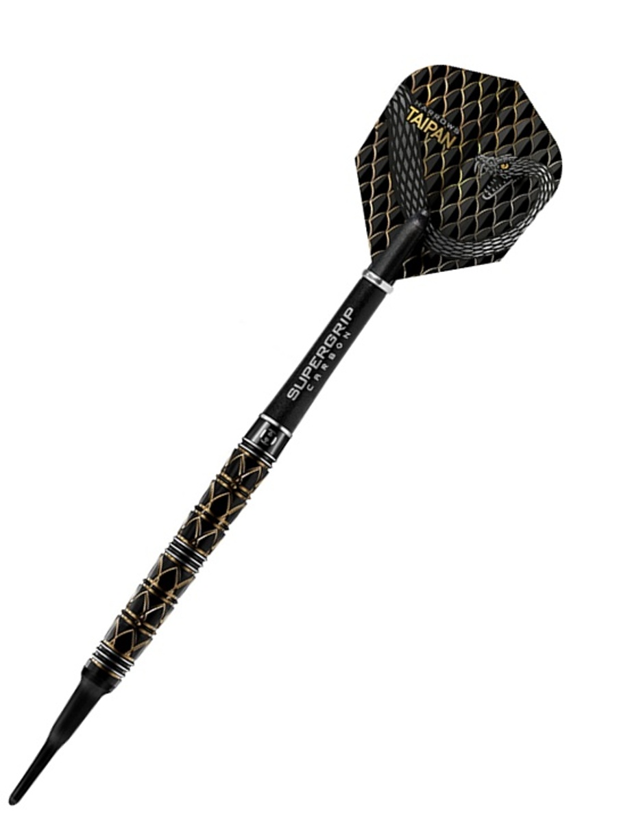 Miękkie rzutki Harrows Taipan to wolframowe rzutki (90% wolframu) o doskonałym designie, który Cię oczaruje. Czarne i złote beczki z unikalnymi rowkami są uzupełnione uchwytami Supergrip Carbon i lotkami Taipan Gold.