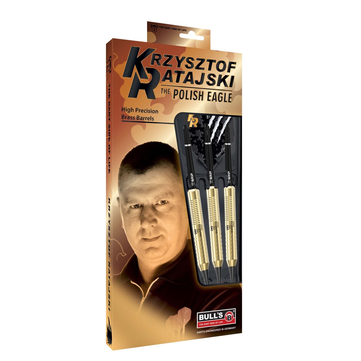 Miękkie rzutki Bull's Krzysztof Ratajski Gold Brass to mosiężne rzutki ze złotymi lufami. Pośrodku lufy znajduje się logo Bull's i podpis gracza. Beczki są uzupełnione nylonowymi uchwytami i pałką z inicjałami Ratajskiego. Rzutki są szczególnie odpowiednie dla początkujących graczy.