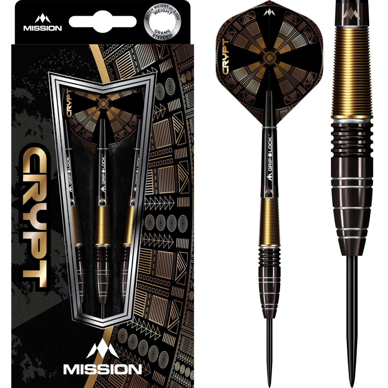Stalowe rzutki Mission Crypt to wolframowe rzutki (90% wolframu) z czarnymi i złotymi lufami o nieziemskim wyglądzie. Beczki są uzupełnione nylonowymi uchwytami Grip Lock i pałkami Mission Crypt.