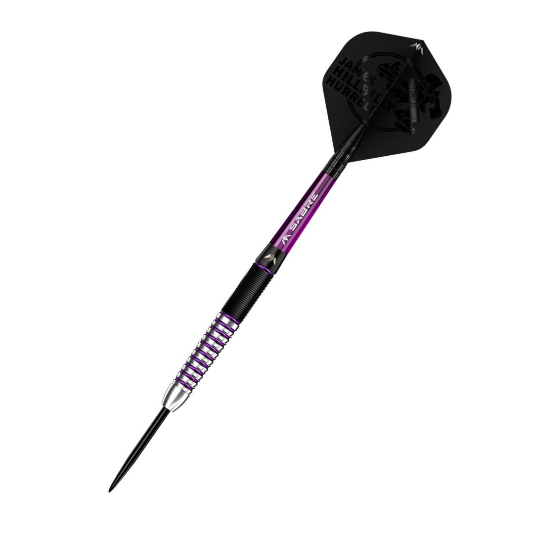 Stalowe rzutki Mission James Hurrell to wolframowe rzutki (90% wolframu) o oszałamiającym wyglądzie. Czarne i srebrne beczki są podkreślone fioletowymi rowkami, które idealnie pasują do fioletowych uchwytów Sabre. Beczki mają dwa rodzaje rowków i są ozdobione logo Mission. Uzupełnieniem są nylonowe uchwyty Sabre i pałki Mission.