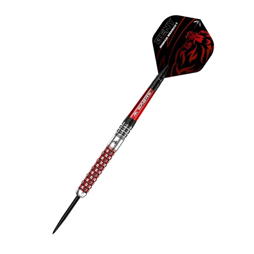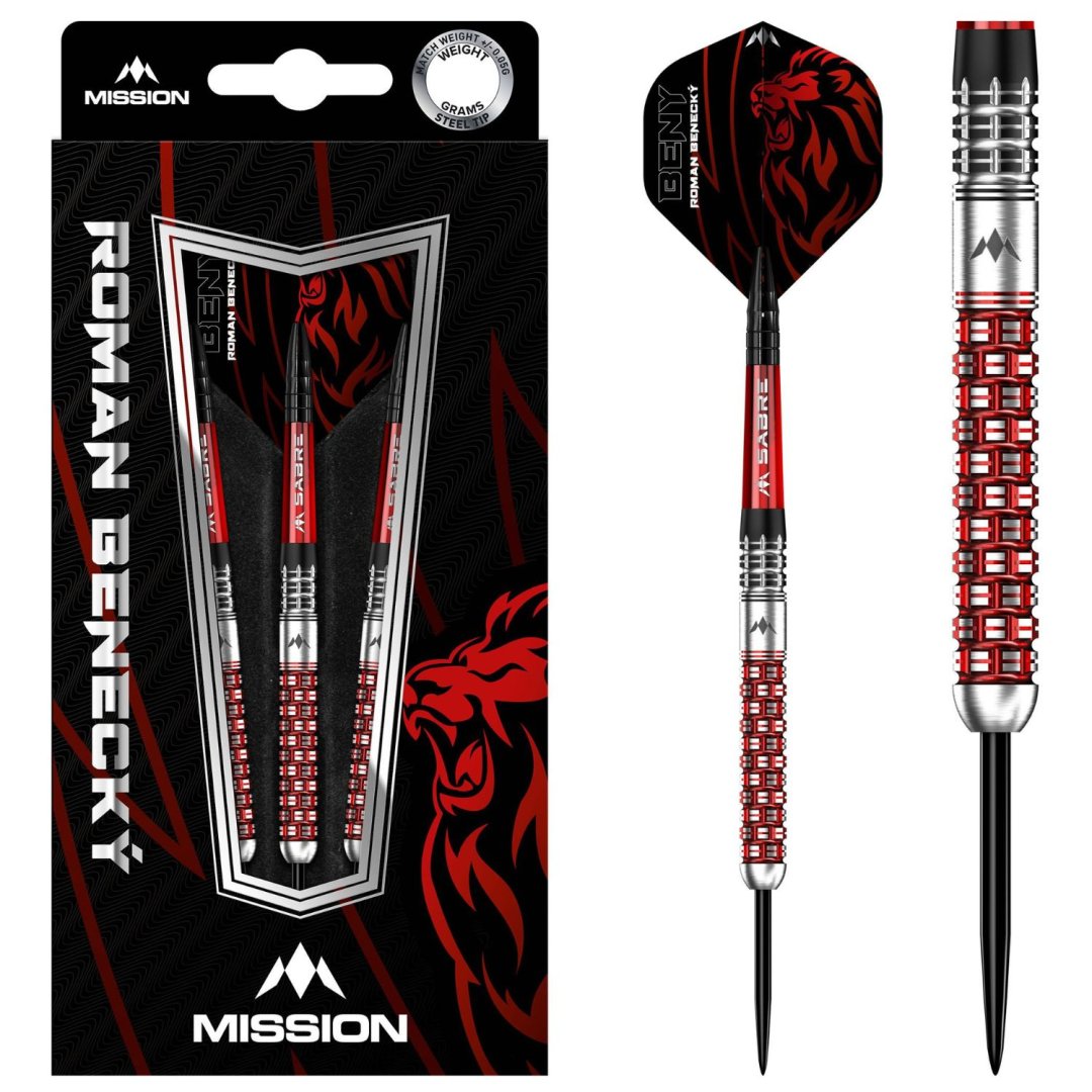 Stalowe lotki Mission Roman Benecky to lotki wolframowe (90% wolframu) z lufami z unikalnymi rowkami. Lotki łączą w sobie siłę i dziedzictwo czeskiego lwa z innowacyjną technologią. Jaskrawoczerwony kolor doskonale podkreśla rowki na lufie. Lufy są uzupełnione nylonowymi uchwytami Sabre i pałkami Mission.