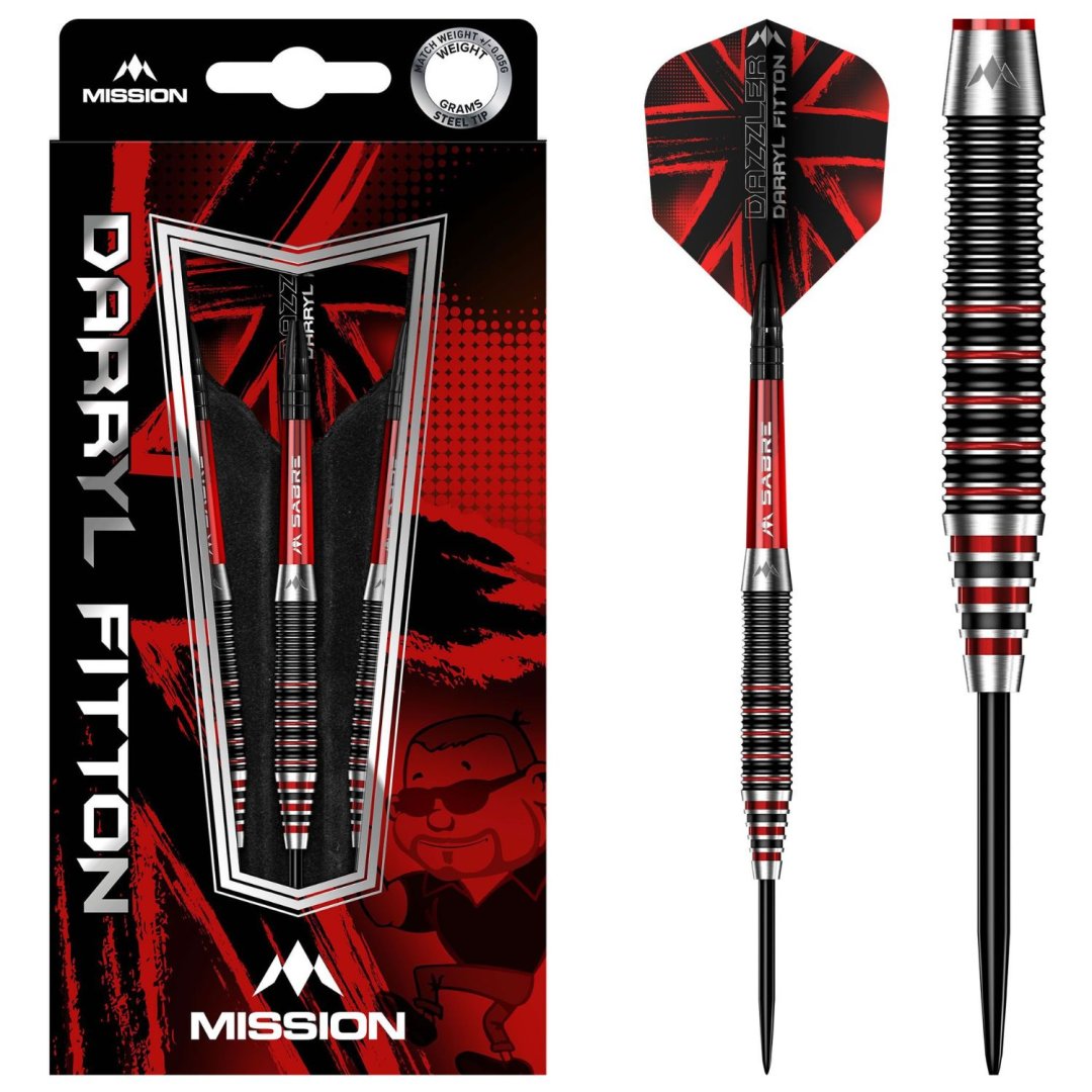 Stalowe lotki Mission Darryl Fitton to lotki wolframowe (95% wolframu) z czerwonymi i czarnymi rowkowanymi lufami. Lufy są uzupełnione nylonowymi uchwytami Sabre i pałkami Mission.