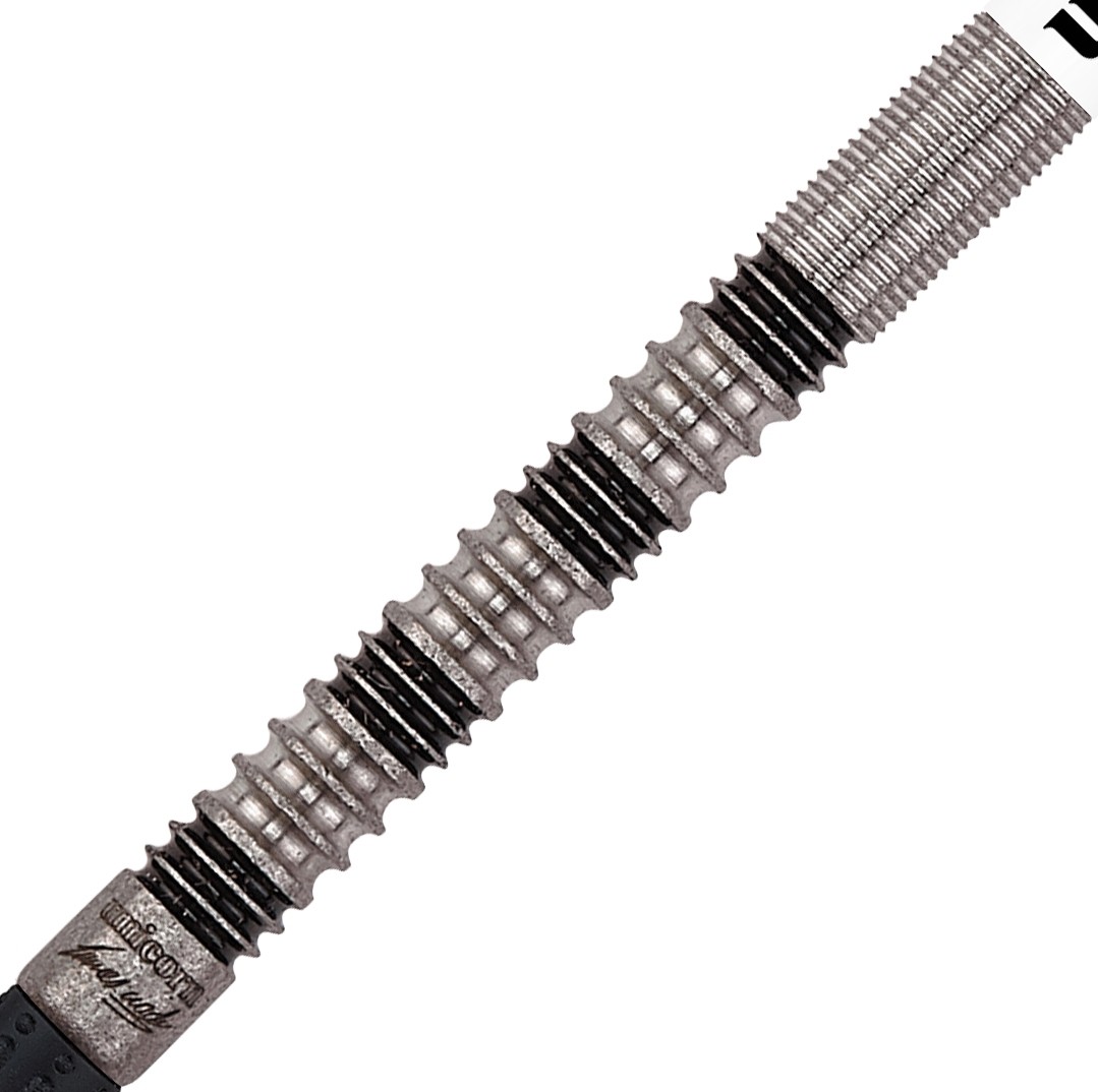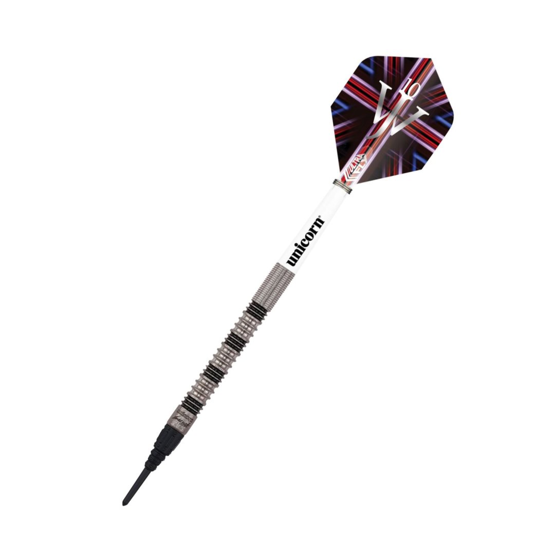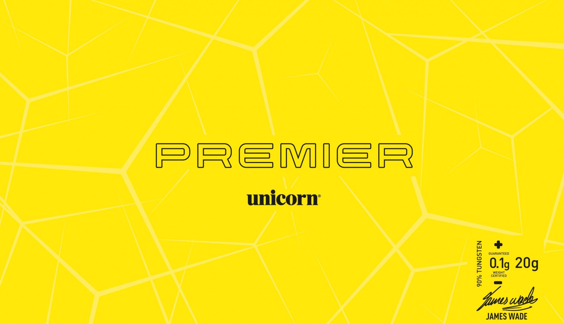 Miękkie rzutki wolframowe Unicorn Premier James Wade (90% wolframu) z lufami w sportowym designie. Beczki mają dwa rodzaje rowków, niektóre rowki są podkreślone czarną farbą. Są one ozdobione podpisem gracza i napisem Unicorn. Lufy są uzupełnione nylonowymi uchwytami i pałkami Ultrafly.