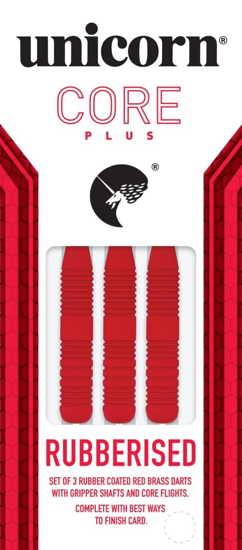 Stalowe rzutki Unicorn Core Plus Rubberised Red to mosiężne rzutki z gumowaną czerwoną powierzchnią. Lufy są rowkowane i są dostarczane z uchwytami Gripper i pałkami Unicorn.