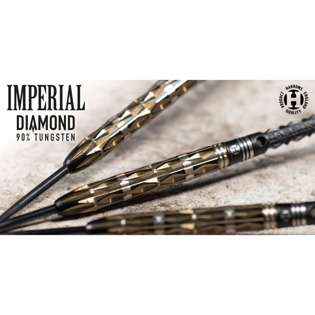 Stalowe lotki Harrows Imperial Diamond to wysokiej jakości lotki wolframowe (90% wolframu), które prezentują wyjątkowe możliwości obróbki Harrows i są naprawdę wyjątkowym produktem. Wgłębienia w kształcie diamentów na całej długości tworzą wizualnie niesamowity wygląd rzutki. Lufa jest pokryta czarnym azotkiem tytanu i przyciągającymi wzrok złotymi powłokami. Lufy są uzupełnione uchwytami Carbon ST i listwami Prime Imperial Diamond.