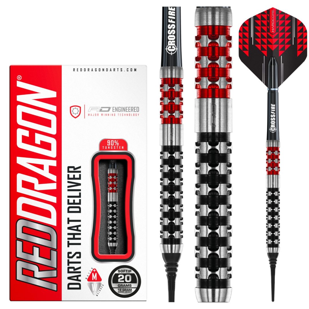 Miękkie rzutki Red Dragon Crossfire to wolframowe rzutki (90% wolframu) o doskonałym designie. Beczki mają oryginalne czarne i czerwone rowki.