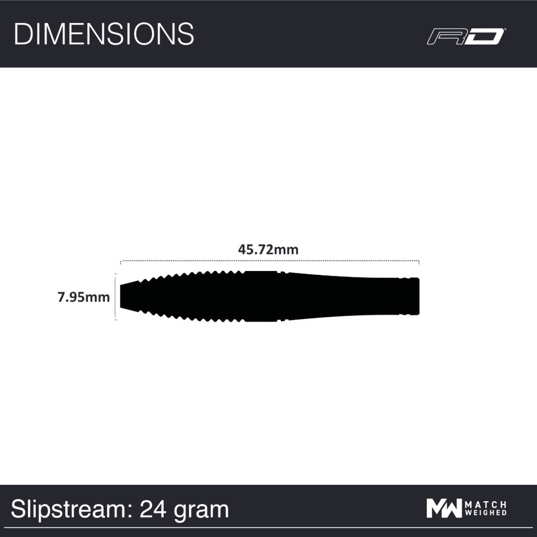 Stalowe lotki Red Dragon Slipstream to lotki wolframowe (90% wolframu) z czarnymi lufami ozdobionymi zielonymi paskami. Lufy są frezowane z tyłu, aby zapewnić niezrównaną aerodynamikę i stabilność lotu. Lufy są uzupełnione uchwytami Nitrotech i uchwytami Red Dragon Hardcore.