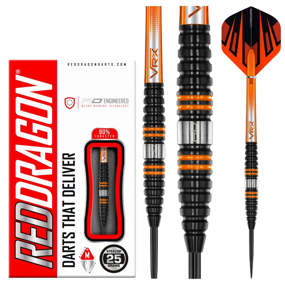 Stalowe lotki Red Dragon Amberjack Pro to lotki wolframowe (90% wolframu) z czarnymi lufami ozdobionymi pomarańczowymi paskami. Uzupełniają je nylonowe uchwyty VRX i łaty Red Dragon Hardcore.