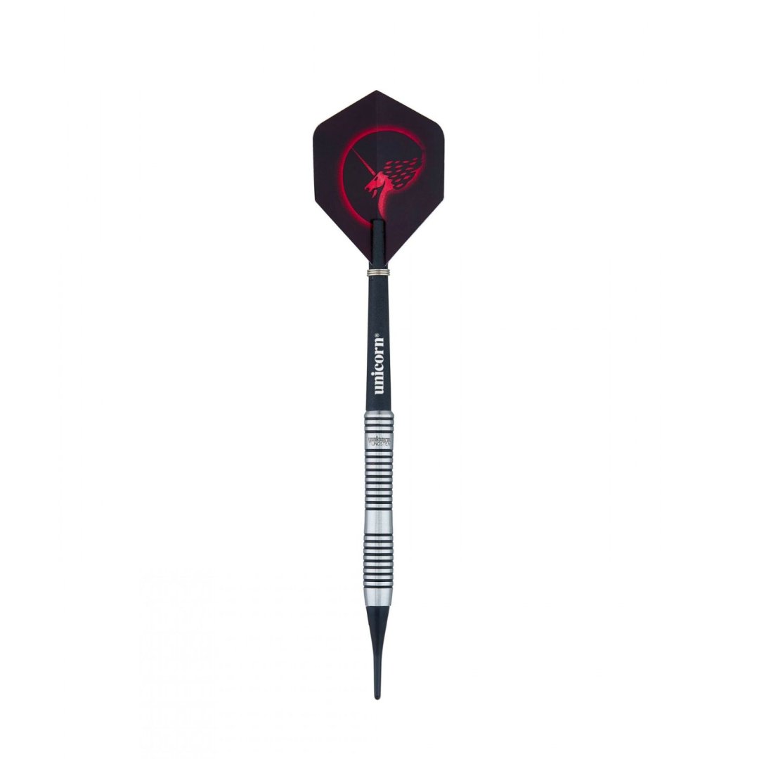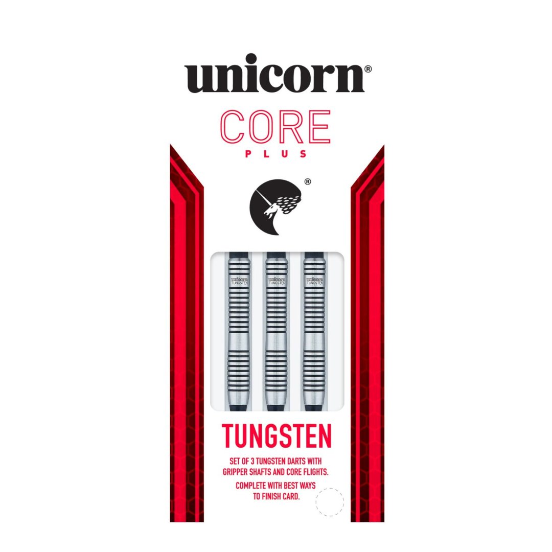 Miękkie lotki Unicorn Core Plus Tungsten to lotki wolframowe (70% wolframu) z lufami z czarnymi rowkami. Na końcu lufy znajduje się napis Unicorn Tungsten. Lufy są wyposażone w uchwyty Gripper i pałki Unicorn.