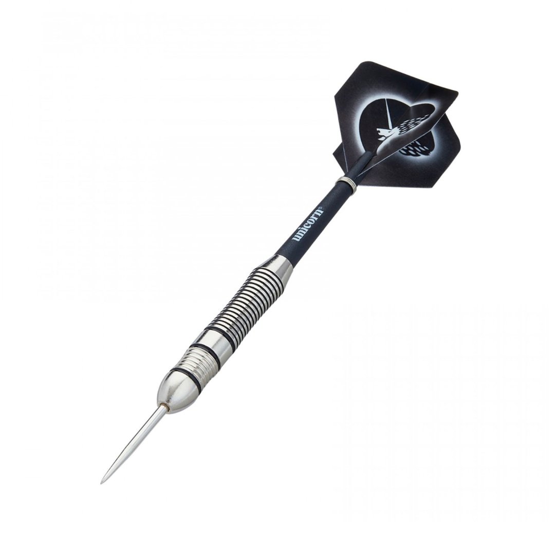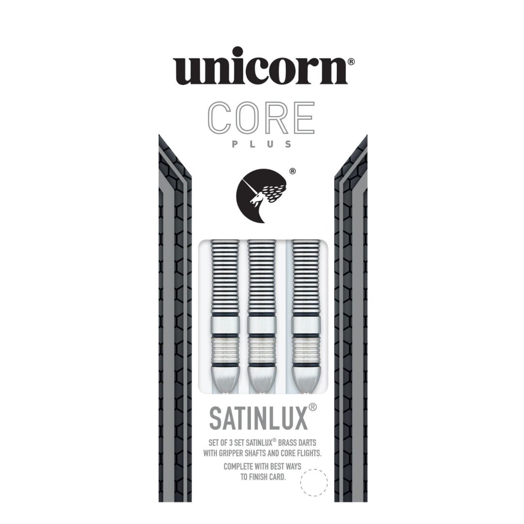Stalowe rzutki Unicorn Core Plus Satinlux to mosiężne rzutki z lufami z czarnymi rowkami. Lufy są uzupełnione uchwytami Gripper i łatami Unicorn.