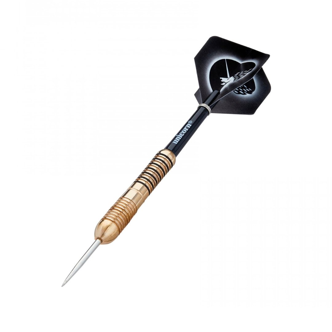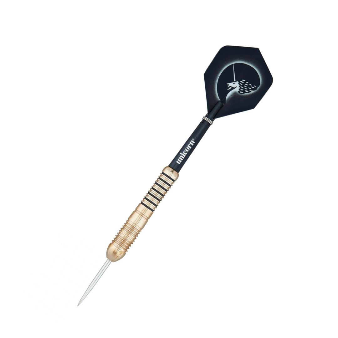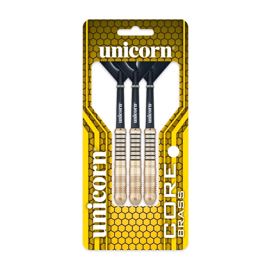 Stalowe rzutki Unicorn Core Brass to mosiężne rzutki ze złotymi lufami z czarnymi paskami z tyłu. Lufy są zakończone uchwytami Gripper i listwami Unicorn.
