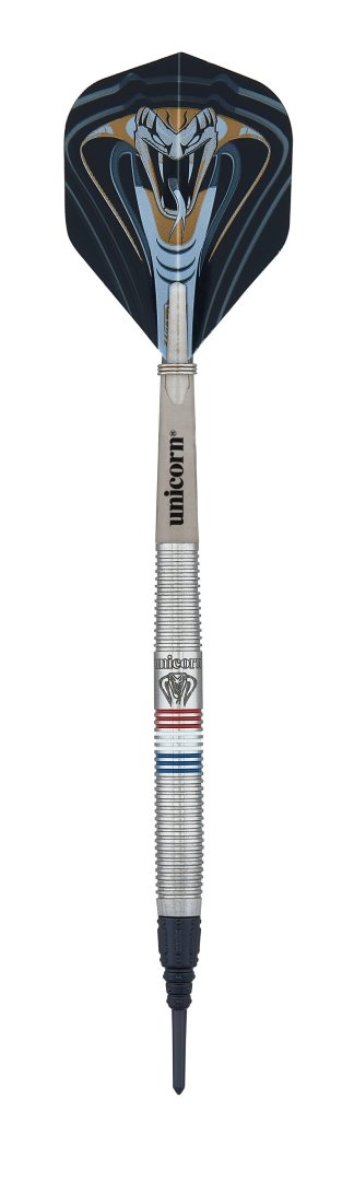 Miękkie lotki Unicorn Maestro Jeffrey De Zwaan to lotki wolframowe (80% wolframu) z radełkowanymi korpusami ozdobionymi niebieskimi, białymi i czerwonymi paskami. Uzupełnieniem są nylonowe uchwyty i eskadry jednorożców.