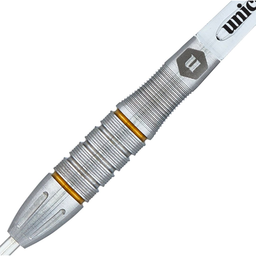 Stalowe lotki Unicorn Pro-Tech to lotki wolframowe (90% wolframu) ze złotymi paskami na lufach. Beczki są uzupełnione nylonowymi uchwytami Gripper i eskadrami Pro-Tech.