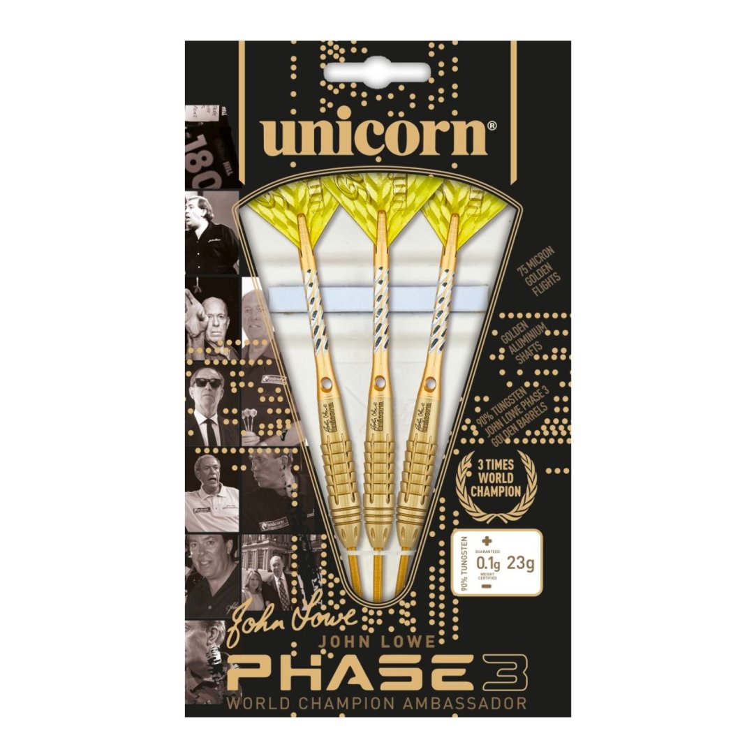 Stalowe lotki World Champion Phase 3 to lotki wolframowe (90% wolframu) ze złotymi lufami ozdobionymi napisem Unicorn i podpisem Johna Lowe'a. Lufy są uzupełnione aluminiowymi uchwytami i pałkami Unicorn.