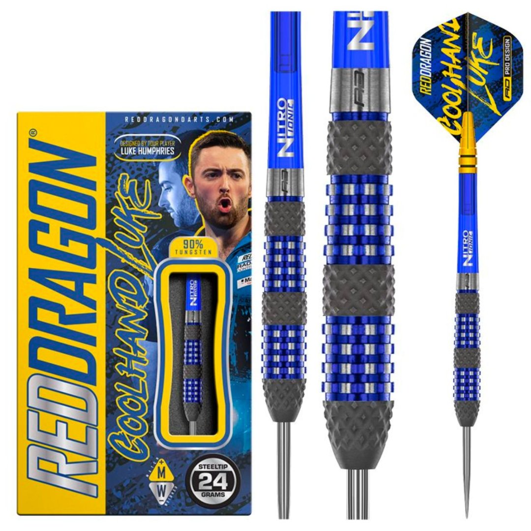 Lotki stalowe Red Dragon Luke Humphries TX2 Atomised to lotki wolframowe (90% wolframu) z beczkami, które łączą dwa rodzaje stref chwytu. Te oszałamiające beczki z ciemnoniebieskimi rowkami i przestrzennymi szarymi strefami uchwytu reprezentują najnowszy projekt Red Dragon. Lufy są wyposażone w nylonowe uchwyty Nitro Ionic i wędki muchowe Luke Humphries.