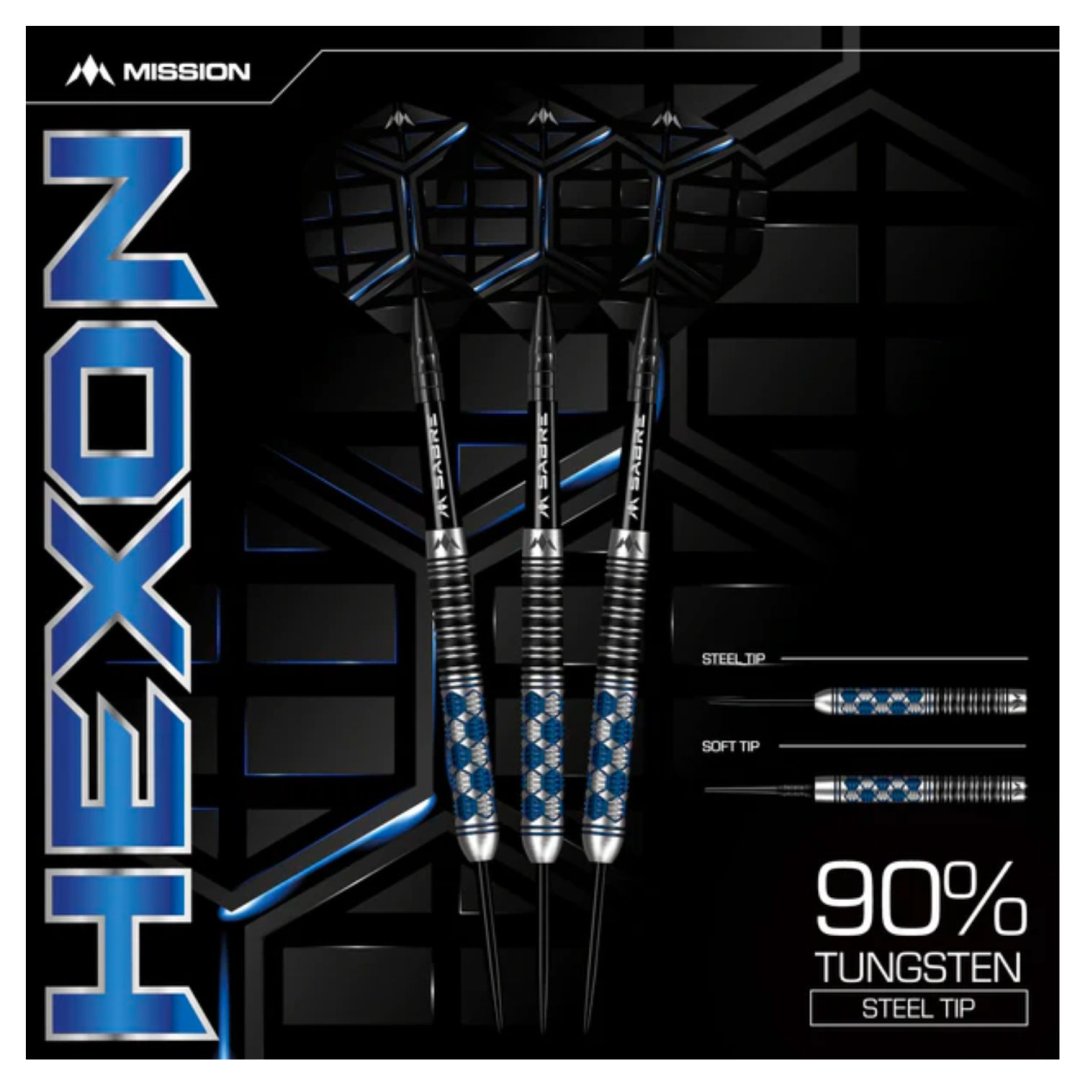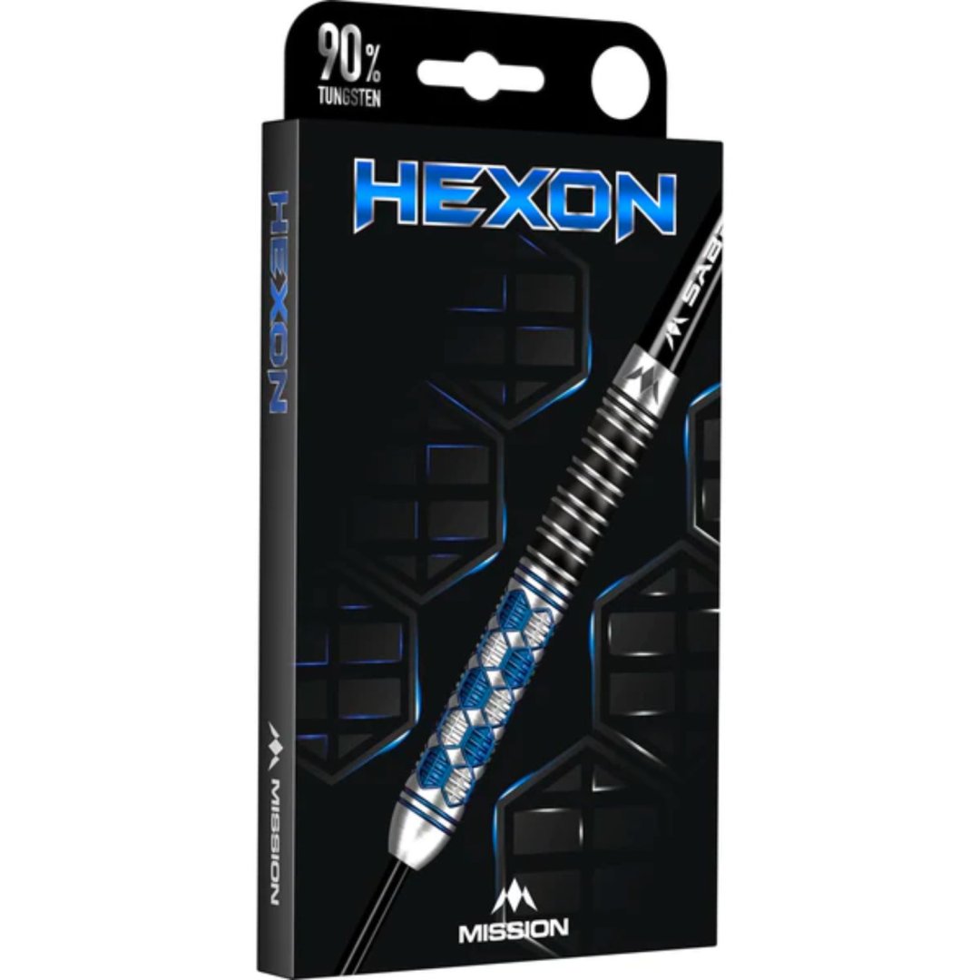 Stalowe rzutki Mission Hexon to wolframowe rzutki (90% wolframu) z oryginalną konstrukcją lufy, która ma unikalny symbol Hexon wyfrezowany w lufie i podkreślony niebieską powłoką PVD. Tylna część lufy ma promieniowe rowki pokryte czarną powłoką PVD. Lufy są uzupełnione nylonowymi uchwytami Sabre i eskadrami Mission.