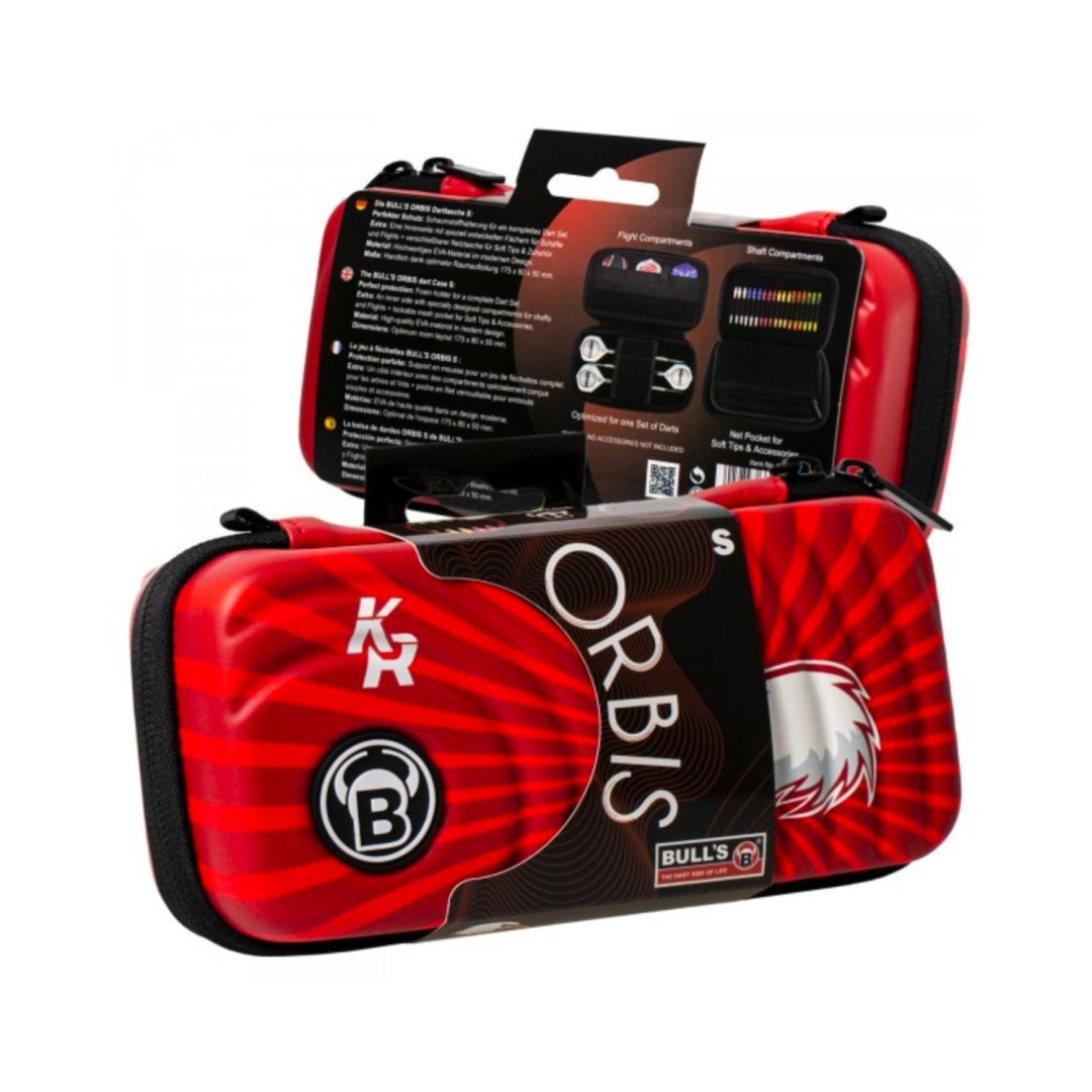 Etui na rzutki Bull's Orbis to najnowsza generacja twardych etui Bull's. Dzięki piankowemu wzmocnieniu, etui zapewnia doskonałą przyczepność i ochronę dla całego zestawu rzutek. Ponadto etui posiada kieszenie na akcesoria, które oferują miejsce na 6 zestawów kijów i 12 uchwytów. W zestawie znajduje się poręczna, zapinana na zamek kieszeń na miękkie końcówki i akcesoria. Kabura Orbis została wykonana z wysokiej jakości wytrzymałego materiału EVA i charakteryzuje się nowoczesnym designem z logo Bull's. Eskadry mogą pozostać na lotkach bez uszkodzenia. Etui ma zamek błyskawiczny i łatwo się otwiera. Etui zawiera również pasek na rękę.